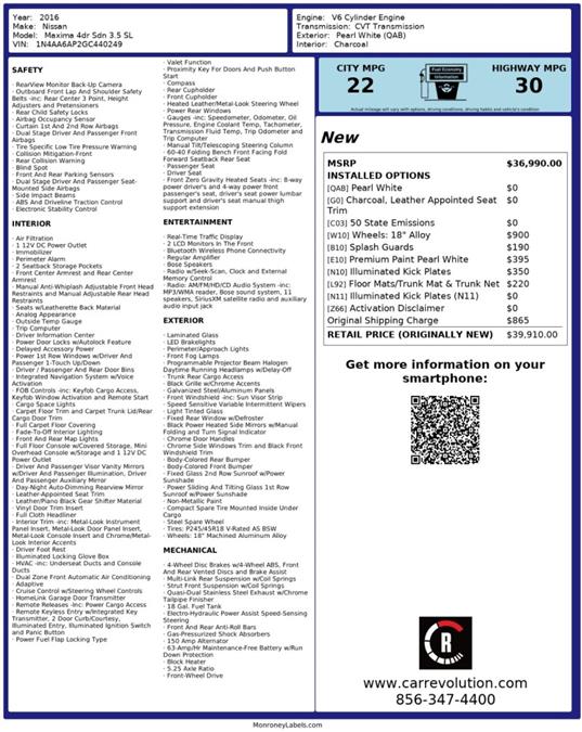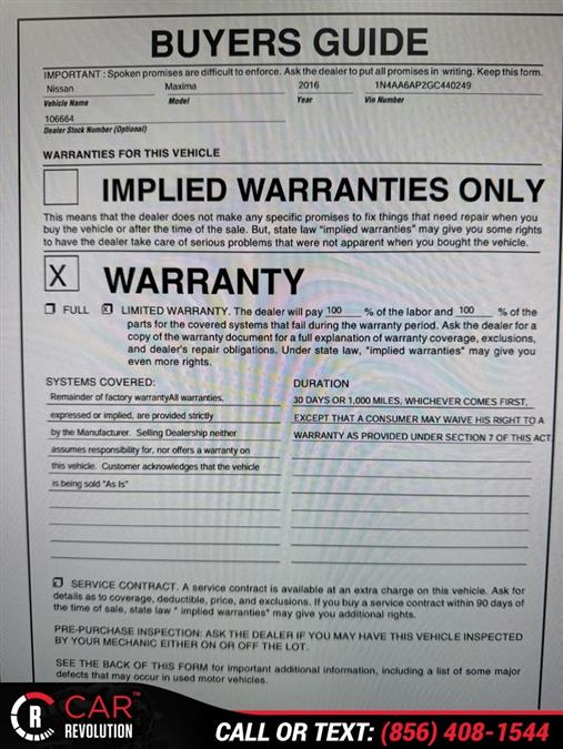 This outstanding example of a 2016 Nissan Maxima 3.5 SL is offered by Car Revolution. This Nissan includes: Optional Equipment: Interior Illuminated Kick Plates Floor Mats/trunk Mat and Trunk Net Carpet front and rear floor mats Carpet cargo mat Cargo net Illuminated Kick Plates Activation Disclaimer Charcoal Convenience Carpet cargo mat Cargo net Fuel Economy and Emissions Federal emissions Comfort Carpet front and rear floor mats Exterior and Appearance Pearlcoat paint Front splash guards Rear splash guards Paint Pearl White Pearlcoat paint Emissions 50 State Emissions Federal emissions Tires & Wheels 18 Alloy Wheels Exterior Splash Guards Front splash guards Rear splash guards Premium Paint - Pearl White *Note - For third party subscriptions or services, please contact the dealer for more information.* This 2016 Nissan Maxima has such low mileage it has been parked more than driven. Marked by excellent quality and features with unmistakable refined leather interior that added value and class to the Nissan Maxima 3.5 SL. Drive any city's streets like you've lived there all your life using the navigation system on this Nissan Maxima. More information about the 2016 Nissan Maxima: The Nissan Maxima starts at a little below $33,000, so while it would never be accused of being an economy car, it is also priced below most luxury vehicles on the marketplace. The Maxima offers more space than the equivalently priced Audi, BMW or Mercedes but it also offers more pace than a high end Camry or Accord. The Maxima tries to let buyers get their cake and eat it too, reproducing the fun driving experience offered by European sports sedans, without reproducing their higher prices and smaller cabins. This model sets itself apart with sporty driving experience, Striking styling, powerful engine, upscale luxury features, and efficient CVT transmission Car Revolution has been in business since 1998 with 2 locations and over 300 cars. A family owned business, focused and determined to extend hospitality to all our clients. We make every effort to present information that is accurate. However, it is based on data provided by the vehicle manufacturer and other sources. Therefore exact Configuration, Color, Certification and Accessories should be used as a guide only and are not guaranteed under any circumstances, for any inaccuracies, claims of losses of any nature. All advertised prices includes all cost to be paid by the consumer, except: Title, Taxes, Registration, License Fees, Insurance, Dealer Prep, Additional Options and include all applicable rebates. Subject to Credit Approval. Every effort is made in order to display accurate and current vehicle information, including Pricing. All vehicles are subjected to prior sale, removal and transport elsewhere, awaiting Title and Ownership Confirmation. Inventory is updated daily and subject to change. Not responsible for typographical errors or omissions. To better insure the specific vehicle's availability, call us right away at 856-316-3444 and feel free to ask any questions. EMG-WB This 2016 Nissan Maxima 3.5 SL is proudly offered by Car Revolution You can tell this 2016 Nissan Maxima has been pampered by the fact that it has less than 81,733mi and appears with a showroom shine. Marked by excellent quality and features with unmistakable refined leather interior that added value and class to the Nissan Maxima 3.5 SL. The Nissan Maxima 3.5 SL has a navigation system installed, so you'll always know where you're going. This top-tier navigation system is reliable and will get you to your destination quickly and by the most efficient route available. More information about the 2016 Nissan Maxima: The Nissan Maxima starts at a little below $33,000, so while it would never be accused of being an economy car, it is also priced below most luxury vehicles on the marketplace. The Maxima offers more space than the equivalently priced Audi, BMW or Mercedes but it also offers more pace than a high end Camry or Accord. The Maxima tries to let buyers get their cake and eat it too, reproducing the fun driving experience offered by European sports sedans, without reproducing their higher prices and smaller cabins. This model sets itself apart with sporty driving experience, Striking styling, powerful engine, upscale luxury features, and efficient CVT transmission Car Revolution has been in business since 1998 with 2 locations and over 300 cars. A family owned business, focused and determined to extend hospitality to all our clients. We make every effort to present information that is accurate. However, it is based on data provided by the vehicle manufacturer and other sources. Therefore exact Configuration, Color, Certification and Accessories should be used as a guide only and are not guaranteed under any circumstances, for any inaccuracies, claims of losses of any nature. All advertised prices includes all cost to be paid by the consumer, except: Title, Taxes, Registration, License Fees, Insurance, Dealer Prep, Additional Options and include all applicable rebates. Subject to Credit Approval. Every effort is made in order to display accurate and current vehicle information, including Pricing. All vehicles are subjected to prior sale, removal and transport elsewhere, awaiting Title and Ownership Confirmation. Inventory is updated daily and subject to change. Not responsible for typographical errors or omissions. To better insure the specific vehicle's availability, call us right away at 856-316-3444 and feel free to ask any questions. EMG-WB Looking for a clean, well-cared for 2016 Nissan Maxima? This is it. The Maxima 3.5 SL is well maintained and has just 81,733mi. This low amount of miles makes this vehicle incomparable to the competition. Based on the superb condition of this vehicle, along with the options and color, this Nissan Maxima 3.5 SL is sure to sell fast. The look is unmistakably Nissan, the smooth contours and cutting-edge technology of this Nissan Maxima 3