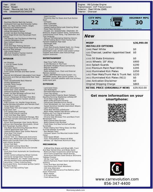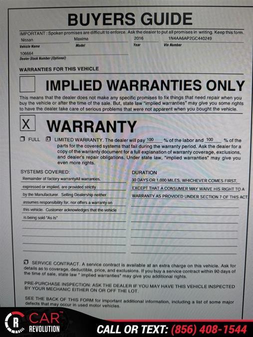 This outstanding example of a 2016 Nissan Maxima 3.5 SL is offered by Car Revolution. This Nissan includes: Optional Equipment: Interior Illuminated Kick Plates Floor Mats/trunk Mat and Trunk Net Carpet front and rear floor mats Carpet cargo mat Cargo net Illuminated Kick Plates Activation Disclaimer Charcoal Convenience Carpet cargo mat Cargo net Fuel Economy and Emissions Federal emissions Comfort Carpet front and rear floor mats Exterior and Appearance Pearlcoat paint Front splash guards Rear splash guards Paint Pearl White Pearlcoat paint Emissions 50 State Emissions Federal emissions Tires & Wheels 18 Alloy Wheels Exterior Splash Guards Front splash guards Rear splash guards Premium Paint - Pearl White *Note - For third party subscriptions or services, please contact the dealer for more information.* This 2016 Nissan Maxima has such low mileage it has been parked more than driven. Marked by excellent quality and features with unmistakable refined leather interior that added value and class to the Nissan Maxima 3.5 SL. Drive any city's streets like you've lived there all your life using the navigation system on this Nissan Maxima. More information about the 2016 Nissan Maxima: The Nissan Maxima starts at a little below $33,000, so while it would never be accused of being an economy car, it is also priced below most luxury vehicles on the marketplace. The Maxima offers more space than the equivalently priced Audi, BMW or Mercedes but it also offers more pace than a high end Camry or Accord. The Maxima tries to let buyers get their cake and eat it too, reproducing the fun driving experience offered by European sports sedans, without reproducing their higher prices and smaller cabins. This model sets itself apart with sporty driving experience, Striking styling, powerful engine, upscale luxury features, and efficient CVT transmission Car Revolution has been in business since 1998 with 2 locations and over 300 cars. A family owned business, focused and determined to extend hospitality to all our clients. We make every effort to present information that is accurate. However, it is based on data provided by the vehicle manufacturer and other sources. Therefore exact Configuration, Color, Certification and Accessories should be used as a guide only and are not guaranteed under any circumstances, for any inaccuracies, claims of losses of any nature. All advertised prices includes all cost to be paid by the consumer, except: Title, Taxes, Registration, License Fees, Insurance, Dealer Prep, Additional Options and include all applicable rebates. Subject to Credit Approval. Every effort is made in order to display accurate and current vehicle information, including Pricing. All vehicles are subjected to prior sale, removal and transport elsewhere, awaiting Title and Ownership Confirmation. Inventory is updated daily and subject to change. Not responsible for typographical errors or omissions. To better insure the specific vehicle's availability, call us right away at 856-316-3444 and feel free to ask any questions. EMG-WB This 2016 Nissan Maxima 3.5 SL is proudly offered by Car Revolution You can tell this 2016 Nissan Maxima has been pampered by the fact that it has less than 81,733mi and appears with a showroom shine. Marked by excellent quality and features with unmistakable refined leather interior that added value and class to the Nissan Maxima 3.5 SL. The Nissan Maxima 3.5 SL has a navigation system installed, so you'll always know where you're going. This top-tier navigation system is reliable and will get you to your destination quickly and by the most efficient route available. More information about the 2016 Nissan Maxima: The Nissan Maxima starts at a little below $33,000, so while it would never be accused of being an economy car, it is also priced below most luxury vehicles on the marketplace. The Maxima offers more space than the equivalently priced Audi, BMW or Mercedes but it also offers more pace than a high end Camry or Accord. The Maxima tries to let buyers get their cake and eat it too, reproducing the fun driving experience offered by European sports sedans, without reproducing their higher prices and smaller cabins. This model sets itself apart with sporty driving experience, Striking styling, powerful engine, upscale luxury features, and efficient CVT transmission Car Revolution has been in business since 1998 with 2 locations and over 300 cars. A family owned business, focused and determined to extend hospitality to all our clients. We make every effort to present information that is accurate. However, it is based on data provided by the vehicle manufacturer and other sources. Therefore exact Configuration, Color, Certification and Accessories should be used as a guide only and are not guaranteed under any circumstances, for any inaccuracies, claims of losses of any nature. All advertised prices includes all cost to be paid by the consumer, except: Title, Taxes, Registration, License Fees, Insurance, Dealer Prep, Additional Options and include all applicable rebates. Subject to Credit Approval. Every effort is made in order to display accurate and current vehicle information, including Pricing. All vehicles are subjected to prior sale, removal and transport elsewhere, awaiting Title and Ownership Confirmation. Inventory is updated daily and subject to change. Not responsible for typographical errors or omissions. To better insure the specific vehicle's availability, call us right away at 856-316-3444 and feel free to ask any questions. EMG-WB Looking for a clean, well-cared for 2016 Nissan Maxima? This is it. The Maxima 3.5 SL is well maintained and has just 81,733mi. This low amount of miles makes this vehicle incomparable to the competition. Based on the superb condition of this vehicle, along with the options and color, this Nissan Maxima 3.5 SL is sure to sell fast. The look is unmistakably Nissan, the smooth contours and cutting-edge technology of this Nissan Maxima 3