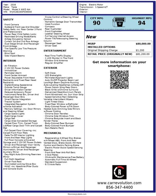 Thank you for visiting another one of Car Revolution's online listings! Please continue for more information on this 2016 Tesla Model X 90D with 80,794mi. This Tesla Model X 90D is an incredibly versatile vehicle that is a must have for any family. Outstanding craftsmanship and artisanal refinements abound with this Tesla Model X 90D. You'll love the feel of AWD in this 2016 Tesla Model X. It provides a perfect balance of handling power and control in virtually every driving condition. It's not a misprint. And the odometer isn't broken. This is a very low mileage Tesla Model X. A rare find these days. More information about the 2016 Tesla Model X: The Model X is not a cheap car, with a base price of around $83,000. However that price is aided by federal tax credits designed to increase sales of alternative fuel vehicles, up to $7,500 in credit is available to buyers in the U.S., with some states even offer additional tax credits. For that price, owners get a luxurious and practical all-wheel drive vehicle that won't cost a penny at the fuel pump. Tesla estimates that buyers will save an average of about $7,400 over an equivalent gasoline powered vehicle, over their first five years of ownership. Interesting features of this model are All-electric drivetrain, potent acceleration, quiet motor, great handling for an SUV, trick doors. Car Revolution has been in business since 1998 with 2 locations and over 300 cars. A family owned business, focused and determined to extend hospitality to all our clients. We make every effort to present information that is accurate. However, it is based on data provided by the vehicle manufacturer and other sources. Therefore exact Configuration, Color, Certification and Accessories should be used as a guide only and are not guaranteed under any circumstances, for any inaccuracies, claims of losses of any nature. All advertised prices includes all cost to be paid by the consumer, except: Title, Taxes, Registration, License Fees, Insurance, Dealer Prep, Additional Options and include all applicable rebates. Subject to Credit Approval. Every effort is made in order to display accurate and current vehicle information, including Pricing. All vehicles are subjected to prior sale, removal and transport elsewhere, awaiting Title and Ownership Confirmation. Inventory is updated daily and subject to change. Not responsible for typographical errors or omissions. To better insure the specific vehicle's availability, call us right away at 856-316-3444 and feel free to ask any questions. EMG-WB