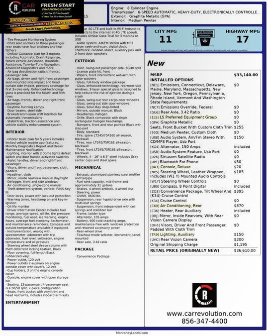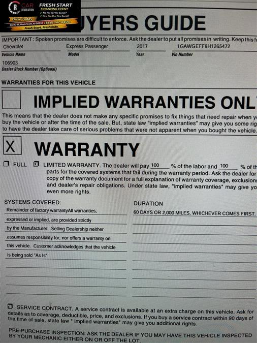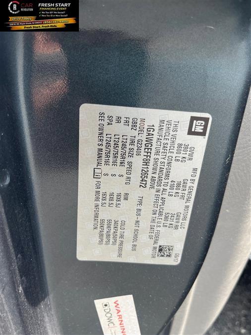 Car Revolution has a wide selection of exceptional pre-owned vehicles to choose from, including this 2017 Chevrolet Express Passenger. It's not a misprint. And the odometer isn't broken. This is a very low mileage Chevrolet Express Passenger. A rare find these days. The look is unmistakably Chevrolet, the smooth contours and cutting-edge technology of this Chevrolet Express Passenger LS RWD will definitely turn heads. The 2017 Chevrolet exterior is finished in a breathtaking Cyber Gray Metallic, while being complemented by such a gorgeous Medium Pewter interior. This color combination is stunning and absolutely beautiful! More information about the 2017 Chevrolet Express Passenger: In a market that's evolving toward world models and lighter builds, the Chevrolet Express vans keep their body-on-frame design oriented for the U.S. market, with better towing capacity than most of the competition. Those interested in long-distance towing or fleet use may want to jump straight to the Duramax diesel version, which allows a GVWR of 9,900 pounds and a tow rating of 9,700 pounds. This model sets itself apart with high towing and weight ratings, available all-wheel drive, available diesel engine, tough truck-like construction, Strong set of V8 engines, and seats up to 15 Car Revolution has been in business since 1998 with 2 locations and over 300 cars. A family owned business, focused and determined to extend hospitality to all our clients. We make every effort to present information that is accurate. However, it is based on data provided by the vehicle manufacturer and other sources. Therefore exact Configuration, Color, Certification and Accessories should be used as a guide only and are not guaranteed under any circumstances, for any inaccuracies, claims of losses of any nature. All advertised prices includes all cost to be paid by the consumer, except: Title, Taxes, Registration, License Fees, Insurance, Dealer Prep, Additional Options and include all applicable rebates. Subject to Credit Approval. Every effort is made in order to display accurate and current vehicle information, including Pricing. All vehicles are subjected to prior sale, removal and transport elsewhere, awaiting Title and Ownership Confirmation. Inventory is updated daily and subject to change. Not responsible for typographical errors or omissions. To better insure the specific vehicle's availability, call us right away at 856-316-3444 and feel free to ask any questions. EMG-WB Car Revolution is pleased to be currently offering this 2017 Chevrolet Express Passenger LS RWD with 65,596mi. With less than 65,596mi on this Chevrolet Express Passenger, you'll appreciate the practically showroom newness of this vehicle. Surprising quality accompanied by a high level of performance...this Cyber Gray Metallic on Medium Pewter Chevrolet Express Passenger LS RWD could end up being the perfect match for you. This is the one. Just what you've been looking for. More information about the 2017 Chevrolet Express Passenger: In a market that's evolving toward world models and lighter builds, the Chevrolet Express vans keep their body-on-frame design oriented for the U.S. market, with better towing capacity than most of the competition. Those interested in long-distance towing or fleet use may want to jump straight to the Duramax diesel version, which allows a GVWR of 9,900 pounds and a tow rating of 9,700 pounds. Interesting features of this model are high towing and weight ratings, available all-wheel drive, available diesel engine, tough truck-like construction, Strong set of V8 engines, and seats up to 15 Car Revolution has been in business since 1998 with 2 locations and over 300 cars. A family owned business, focused and determined to extend hospitality to all our clients. We make every effort to present information that is accurate. However, it is based on data provided by the vehicle manufacturer and other sources. Therefore exact Configuration, Color, Certification and Accessories should be used as a guide only and are not guaranteed under any circumstances, for any inaccuracies, claims of losses of any nature. All advertised prices includes all cost to be paid by the consumer, except: Title, Taxes, Registration, License Fees, Insurance, Dealer Prep, Additional Options and include all applicable rebates. Subject to Credit Approval. Every effort is made in order to display accurate and current vehicle information, including Pricing. All vehicles are subjected to prior sale, removal and transport elsewhere, awaiting Title and Ownership Confirmation. Inventory is updated daily and subject to change. Not responsible for typographical errors or omissions. To better insure the specific vehicle's availability, call us right away at 856-316-3444 and feel free to ask any questions. EMG-WB Contact Car Revolution today for information on dozens of vehicles like this 2017 Chevrolet Express Passenger LS RWD. The Express Passenger LS RWD has been lightly driven and there is little to no wear and tear on this vehicle. The care taken on this pre-owned vehicle is reflective of the 65,596mi put on this Chevrolet. This is the one. Just what you've been looking for. There are many vehicles on the market but if you are looking for a vehicle that will perform as good as it looks then this Chevrolet Express Passenger LS RWD is the one! More information about the 2017 Chevrolet Express Passenger: In a market that's evolving toward world models and lighter builds, the Chevrolet Express vans keep their body-on-frame design oriented for the U.S. market, with better towing capacity than most of the competition. Those interested in long-distance towing or fleet use may want to jump straight to the Duramax diesel version, which allows a GVWR of 9,900 pounds and a tow rating of 9,700 pounds. Strengths of this model include high towing and weight ratings, available all-wheel drive, available diesel engine, tough truck-like construction, Strong set of V8 engines, and 