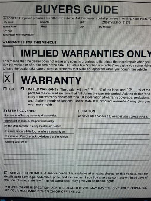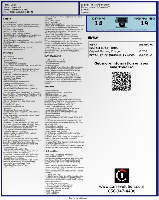 This 2017 Maserati Levante S is offered to you for sale by Car Revolution. Do so much more with one vehicle. This Maserati Levante gives you everything you need an automobile to be. Is it possible to fall in love with a vehicle? It is when your vehicle is as prestige as the Maserati Levante. Enjoy driving? Well now you will get more thrills behind the wheel thanks to the heightened performance of AWD. Better handling. Better traction. Better driving experience. In addition to being well-cared for, this Maserati Levante has very low mileage making it a rare find. Car Revolution has been in business since 1998 with 2 locations and over 300 cars. A family owned business, focused and determined to extend hospitality to all our clients. We make every effort to present information that is accurate. However, it is based on data provided by the vehicle manufacturer and other sources. Therefore exact Configuration, Color, Certification and Accessories should be used as a guide only and are not guaranteed under any circumstances, for any inaccuracies, claims of losses of any nature. All advertised prices includes all cost to be paid by the consumer, except: Title, Taxes, Registration, License Fees, Insurance, Dealer Prep, Additional Options and include all applicable rebates. Subject to Credit Approval. Every effort is made in order to display accurate and current vehicle information, including Pricing. All vehicles are subjected to prior sale, removal and transport elsewhere, awaiting Title and Ownership Confirmation. Inventory is updated daily and subject to change. Not responsible for typographical errors or omissions. To better insure the specific vehicle's availability, call us right away at 856-316-3444 and feel free to ask any questions. EMG-WB