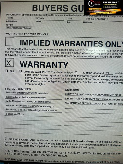 2018HondaOdyssey One of the best things about this Honda Odyssey is that it has low, low mileage. It's ready for you to truly break it in. Just what you've been looking for. With quality in mind, this vehicle is the perfect addition to take home. Based on the superb condition of this vehicle, along with the options and color, this Honda Odyssey EX is sure to sell fast. The look is unmistakably Honda, the smooth contours and cutting-edge technology of this Honda Odyssey EX will definitely turn heads. Car Revolution has been in business since 1998 with 2 locations and over 300 cars. A family owned business, focused and determined to extend hospitality to all our clients. We make every effort to present information that is accurate. However, it is based on data provided by the vehicle manufacturer and other sources. Therefore exact Configuration, Color, Certification and Accessories should be used as a guide only and are not guaranteed under any circumstances, for any inaccuracies, claims of losses of any nature. All advertised prices includes all cost to be paid by the consumer, except: Title, Taxes, Registration, License Fees, Insurance, Dealer Prep, Additional Options and include all applicable rebates. Subject to Credit Approval. Every effort is made in order to display accurate and current vehicle information, including Pricing. All vehicles are subjected to prior sale, removal and transport elsewhere, awaiting Title and Ownership Confirmation. Inventory is updated daily and subject to change. Not responsible for typographical errors or omissions. To better insure the specific vehicle's availability, call us right away at 856-316-3444 and feel free to ask any questions. EMG-WB