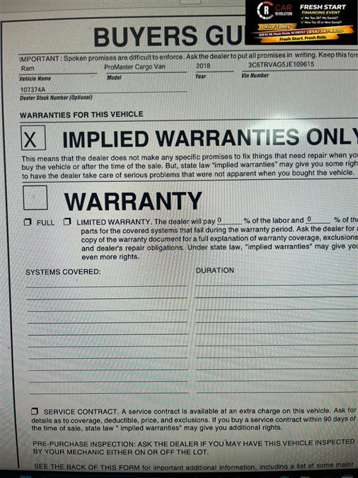 Thank you for visiting another one of Car Revolution's online listings! Please continue for more information on this 2018 Ram ProMaster Cargo Van with 101,985mi. This Ram includes: Optional Equipment: Convenience Fixed rear windshield Comfort Vinyl front seat upholstery Deep tinted windows Exterior and Appearance Non-metallic paint Front license plate bracket Seating Vinyl Bucket Seats Bucket front seats Vinyl front seat upholstery Exterior Front License Plate Bracket Front license plate bracket Rear Hinged Doors with Fixed Glass Split swing-out rear cargo door Deep tinted windows Fixed rear windshield Deep Tint Sunscreen Glass Deep tinted windows Additional Options Quick Order Package 21A Interior Manufacturer's Statement of Origin Black Paint Bright White Clearcoat Non-metallic paint *Note - For third party subscriptions or services, please contact the dealer for more information.* The ProMaster Cargo Van has been lightly driven and there is little to no wear and tear on this vehicle. The care taken on this pre-owned vehicle is reflective of the 101,985mi put on this Ram. The 2018 Ram exterior is finished in a breathtaking Bright White Clearcoat, while being complemented by such a gorgeous Black interior. This color combination is stunning and absolutely beautiful! The look is unmistakably Ram, the smooth contours and cutting-edge technology of this Ram ProMaster Cargo Van will definitely turn heads. Car Revolution has been in business since 1998 with 2 locations and over 300 cars. A family owned business, focused and determined to extend hospitality to all our clients. We make every effort to present information that is accurate. However, it is based on data provided by the vehicle manufacturer and other sources. Therefore exact Configuration, Color, Certification and Accessories should be used as a guide only and are not guaranteed under any circumstances, for any inaccuracies, claims of losses of any nature. All advertised prices includes all cost to be paid by the consumer, except: Title, Taxes, Registration, License Fees, Insurance, Dealer Prep, Additional Options and include all applicable rebates. Subject to Credit Approval. Every effort is made in order to display accurate and current vehicle information, including Pricing. All vehicles are subjected to prior sale, removal and transport elsewhere, awaiting Title and Ownership Confirmation. Inventory is updated daily and subject to change. Not responsible for typographical errors or omissions. To better insure the specific vehicle's availability, call us right away at 856-316-3444 and feel free to ask any questions. EMG-WB Thank you for visiting another one of Car Revolution's online listings! Please continue for more information on this 2018 Ram ProMaster Cargo Van with 16,357mi. One of the best things about this Ram ProMaster Cargo Van is that it has low, low mileage. It's ready for you to truly break it in. Just what you've been looking for. With quality in mind, this vehicle is the perfect addition to take home. There are many vehicles on the market but if you are looking for a vehicle that will perform as good as it looks then this Ram ProMaster Cargo Van is the one! There is no reason why you shouldn't buy this Ram ProMaster Cargo Van . It is incomparable for the price and quality. Car Revolution has been in business since 1998 with 2 locations and over 300 cars. A family owned business, focused and determined to extend hospitality to all our clients. We make every effort to present information that is accurate. However, it is based on data provided by the vehicle manufacturer and other sources. Therefore exact Configuration, Color, Certification and Accessories should be used as a guide only and are not guaranteed under any circumstances, for any inaccuracies, claims of losses of any nature. All advertised prices includes all cost to be paid by the consumer, except: Title, Taxes, Registration, License Fees, Insurance, Dealer Prep, Additional Options and include all applicable rebates. Subject to Credit Approval. Every effort is made in order to display accurate and current vehicle information, including Pricing. All vehicles are subjected to prior sale, removal and transport elsewhere, awaiting Title and Ownership Confirmation. Inventory is updated daily and subject to change. Not responsible for typographical errors or omissions. To better insure the specific vehicle's availability, call us right away at 856-316-3444 and feel free to ask any questions. EMG-WB