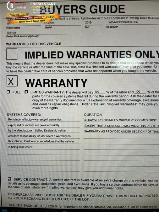 Looking for a clean, well-cared for 2019 BMW 4 Series? This is it. Quality and prestige abound with this BMW 4 Series 430i xDrive. This wonderfully fuel-efficient vehicle offers a supple ride, quick acceleration and superior styling without sacrificing MPGs. This BMW 4 Series features AWD. That means power and control delivered to all four wheels for maximum grip and improved handling. It's not a misprint. And the odometer isn't broken. This is a very low mileage BMW 4 Series. A rare find these days. Performance, ease of use and efficiency are just a few reasons you'll love the navigation system that comes with this car. Car Revolution has been in business since 1998 with 2 locations and over 300 cars. A family owned business, focused and determined to extend hospitality to all our clients. We make every effort to present information that is accurate. However, it is based on data provided by the vehicle manufacturer and other sources. Therefore exact Configuration, Color, Certification and Accessories should be used as a guide only and are not guaranteed under any circumstances, for any inaccuracies, claims of losses of any nature. All advertised prices includes all cost to be paid by the consumer, except: Title, Taxes, Registration, License Fees, Insurance, Dealer Prep, Additional Options and include all applicable rebates. Subject to Credit Approval. Every effort is made in order to display accurate and current vehicle information, including Pricing. All vehicles are subjected to prior sale, removal and transport elsewhere, awaiting Title and Ownership Confirmation. Inventory is updated daily and subject to change. Not responsible for typographical errors or omissions. To better insure the specific vehicle's availability, call us right away at 856-316-3444 and feel free to ask any questions. EMG-WB