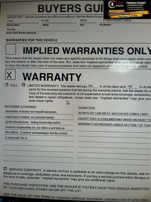 Looking for a clean, well-cared for 2019 Ford F-150? This is it. This Ford includes: Optional Equipment: Safety and Security Remote activated perimeter approach lighting Illuminated entry Security system MyKey restricted driving mode/alerts Rear parking sensors Remote panic alarm Safety MyKey MyKey restricted driving mode/alerts Perimeter Alarm Security system Convenience Power door mirrors Steering wheel mounted audio controls Cruise control with steering wheel mounted controls Retained accessory power Power door locks with 2 stage unlocking Keyfob keyless entry All-in-one remote fob and ignition key Auto-locking doors Tailgate/power door lock Inclinometer Redundant digital speedometer Bulb failure warning Trip computer Power first-row windows Power second-row windows Driver and passenger one-touch down windows Driver and passenger one-touch up windows Driver information center Comfort Vinyl front seat upholstery Vinyl front seatback upholstery Full carpet floor covering Carpet front and rear floor mats Vinyl rear seat upholstery Exterior and Appearance Running boards Tough Bed spray-in pickup bed liner Body-colored front bumper Body-colored rear bumper Metallic paint Exterior badging Class IV tow rating Trailer hitch Front license plate bracket Body-colored front bumper rub strip Seating VINYL 40/20/40 FRONT SEAT 40-20-40 split-bench front seat Vinyl front seat upholstery Vinyl front seatback upholstery Vinyl rear seat upholstery Carpet rear seatback upholstery Split-bench front seat Front seat center armrest Exterior BLACK PLATFORM RUNNING BOARDS Running boards FRONT LICENSE PLATE BRACKET Front license plate bracket BEDLINER-TOUGHBED SPRAYIN*ACCY Tough Bed spray-in pickup bed liner Power Glass Sideview Mirrors with Black Skull Caps Power door mirrors Driver convex spotter mirror Standard style side mirrors Manual folding door mirrors Black door mirrors Box Side Decals Exterior badging Body-Color Front and Rear Bumpers Body-colored front bumper Body-colored rear bumper Body-colored front bumper rub strip In-car Entertainment SYNC external memory control SYNC voice activated audio controls Bluetooth wireless audio streaming Additional Options XL SPORT APPEARANCE PACKAGE Body-colored front bumper Body-colored rear bumper Exterior badging Body-colored front bumper rub strip Equipment Group 101A Mid 2 total number of 1st row displays 4.2 inch primary display Inclinometer Redundant digital speedometer Bulb failure warning Service interval indicator Trip computer Driver information center XL Power Equipment Group Power door mirrors Driver convex spotter mirror Remote activated perimeter approach lighting Standard style side mirrors Illuminated entry Retained accessory power Power door locks with 2 stage unlocking Keyfob keyless entry All-in-one remote fob and ignition key Auto-locking doors Tailgate/power door lock Manual folding door mirrors Security system MyKey restricted driving mode/alerts Power first-row windows Power second-row windows Driver and passenger one-touch down windows Driver and passenger one-touch up windows Black door mirrors Remote panic alarm Power Front and Rear Windows Retained accessory power Power first-row windows Power second-row windows Driver and passenger one-touch down windows Driver and passenger one-touch up windows Interior REVERSE SENSING SYSTEM Rear parking sensors COLOR-COORDINATED CARPET Full carpet floor covering Carpet front and rear floor mats Full carpet floor covering Carpet front and rear floor mats MEDIUM GRAY VINYL 40/20/40 Cruise Control Cruise control with steering wheel mounted controls 4.2 Productivity Screen in Instrument Cluster 2 total number of 1st row displays 4.2 inch primary display Inclinometer Redundant digital speedometer Bulb failure warning Service interval indicator Trip computer Driver information center Power Tailgate Lock Tailgate/power door lock Illuminated Entry Illuminated entry Power Door Locks Remote activated perimeter approach lighting Power door locks with 2 stage unlocking Keyfob keyless entry All-in-one remote fob and ignition key Auto-locking doors Remote panic alarm Entertainment SYNC SYNC external memory control Steering wheel mounted audio controls SYNC voice activated audio controls Bluetooth wireless audio streaming 4.2 inch primary display 911 Assist emergency SOS system via mobile device Bluetooth handsfree wireless device connectivity AppLink smart device app link 1 USB port AM/FM Paint VELOCITY BLUE Metallic paint Emissions 50 STATE EMISSIONS Federal emissions Trailering CLASS IV TRAILER HITCH Trailer wiring harness Class IV tow rating Trailer hitch Technology and Telematics 911 Assist emergency SOS system via mobile device Bluetooth handsfree wireless device connectivity AppLink smart device app link 1 USB port *Note - For third party subscriptions or services, please contact the dealer for more information.* This 4WD-equipped vehicle will handle beautifully on any terrain and in any weather condition your may find yourself in. The benefits of driving a 4 wheel drive vehicle, such as this Ford F-150 XL, include superior traction and stability. It's not often you find just the vehicle you are looking for AND with low mileage. This is your chance to take home a pre-owned and barely driven Ford F-150. You've found the one you've been looking for. Your dream car. Car Revolution has been in business since 1998 with 2 locations and over 300 cars. A family owned business, focused and determined to extend hospitality to all our clients. We make every effort to present information that is accurate. However, it is based on data provided by the vehicle manufacturer and other sources. Therefore exact Configuration, Color, Certification and Accessories should be used as a guide only and are not guaranteed under any circumstances, for any inaccuracies, claims of losses of any nature. All advertised prices includes all cost to be paid by the consumer, except: Title, Taxes, Registration, License Fees, Insurance, Dealer P