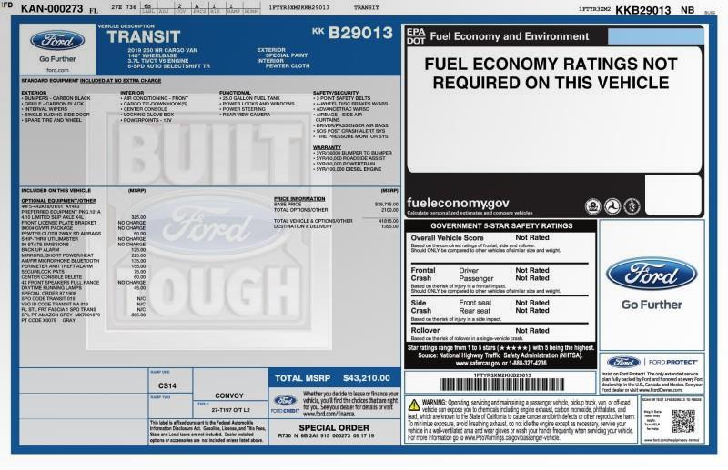 Car Revolution has a wide selection of exceptional pre-owned vehicles to choose from, including this 2019 Ford Transit Van. This Ford includes: Optional Equipment: Safety and Security Daytime running lights Back-up alarm SecuriLock immobilizer Security system Turn signal indicator in door mirrors Safety SECURILOCK PATS SecuriLock immobilizer PERIMETER ANTI THEFT ALARM Security system BACK UP ALARM Back-up alarm Convenience Heated driver and passenger side door mirrors Power folding door mirrors Comfort Manual driver seat lumbar Cloth front seat upholstery Cloth front seatback upholstery Front passenger seat armrest Driver seat manual reclining, lumbar support and fore/aft control Exterior and Appearance Front license plate bracket Seating PEWTER CLOTH 2WAY SD AIRBAGS Bucket front seats Manual driver seat lumbar Driver seat armrest Front passenger seat armrest Driver seat manual reclining, lumbar support and fore/aft control Passenger seat manual reclining and fore/aft control Cloth Front Bucket Seats Bucket front seats Cloth front seat upholstery Cloth front seatback upholstery Powertrain and Mechanical Mechanical limited slip differential Exterior FRONT LICENSE PLATE BRACKET Front license plate bracket MIRRORS, SHORT POWER/HEAT Power door mirrors Heated driver and passenger side door mirrors Power folding door mirrors Turn signal indicator in door mirrors DAYTIME RUNNING LAMPS Daytime running lights Additional Options Order Code 101A SHIP-THRU UTILIMASTER In-car Entertainment External memory control Interior CENTER CONSOLE DELETE PEWTER CLOTH Entertainment AM/FM MICROPHONE BLUETOOTH Auxiliary input jack External memory control Bluetooth handsfree wireless device connectivity 1 USB port AM/FM Emissions 50 STATE EMISSIONS ULEV II emissions Tier 2 Bin 8 emissions Technology and Telematics Bluetooth handsfree wireless device connectivity 1 USB port Suspension 4.10 LIMITED SLIP AXLE X4L Mechanical limited slip differential *Note - For third party subscriptions or services, please contact the dealer for more information.* Surprising quality accompanied by a high level of performance...this Blue Jeans Metallic on Charcoal Black Ford Transit Van could end up being the perfect match for you. This is the one. Just what you've been looking for. There are many vehicles on the market but if you are looking for a vehicle that will perform as good as it looks then this Ford Transit Van is the one! Car Revolution has been in business since 1998 with 2 locations and over 300 cars. A family owned business, focused and determined to extend hospitality to all our clients. We make every effort to present information that is accurate. However, it is based on data provided by the vehicle manufacturer and other sources. Therefore exact Configuration, Color, Certification and Accessories should be used as a guide only and are not guaranteed under any circumstances, for any inaccuracies, claims of losses of any nature. All advertised prices includes all cost to be paid by the consumer, except: Title, Taxes, Registration, License Fees, Insurance, Dealer Prep, Additional Options and include all applicable rebates. Subject to Credit Approval. Every effort is made in order to display accurate and current vehicle information, including Pricing. All vehicles are subjected to prior sale, removal and transport elsewhere, awaiting Title and Ownership Confirmation. Inventory is updated daily and subject to change. Not responsible for typographical errors or omissions. To better insure the specific vehicle's availability, call us right away at 856-316-3444 and feel free to ask any questions. EMG-WB 2019FordTransit Van There are many vehicles on the market but if you are looking for a vehicle that will perform as good as it looks then this Ford Transit Van is the one! This is about the time when you're saying it is too good to be true, and let us be the one's to tell you, it is absolutely true. There is no reason why you shouldn't buy this Ford Transit Van . It is incomparable for the price and quality. Just what you've been looking for. With quality in mind, this vehicle is the perfect addition to take home. Car Revolution has been in business since 1998 with 2 locations and over 300 cars. A family owned business, focused and determined to extend hospitality to all our clients. We make every effort to present information that is accurate. However, it is based on data provided by the vehicle manufacturer and other sources. Therefore exact Configuration, Color, Certification and Accessories should be used as a guide only and are not guaranteed under any circumstances, for any inaccuracies, claims of losses of any nature. All advertised prices includes all cost to be paid by the consumer, except: Title, Taxes, Registration, License Fees, Insurance, Dealer Prep, Additional Options and include all applicable rebates. Subject to Credit Approval. Every effort is made in order to display accurate and current vehicle information, including Pricing. All vehicles are subjected to prior sale, removal and transport elsewhere, awaiting Title and Ownership Confirmation. Inventory is updated daily and subject to change. Not responsible for typographical errors or omissions. To better insure the specific vehicle's availability, call us right away at 856-316-3444 and feel free to ask any questions. EMG-WB