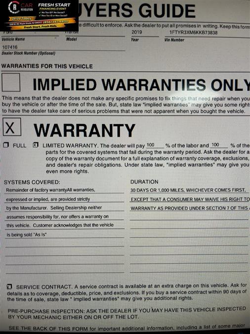 Check out this pre-owned 2019 Ford Transit Van we recently got in. This Ford includes: Optional Equipment: Safety and Security Daytime running lights Back-up alarm SecuriLock immobilizer Security system Turn signal indicator in door mirrors Safety SECURILOCK PATS SecuriLock immobilizer PERIMETER ANTI THEFT ALARM Security system BACK UP ALARM Back-up alarm Convenience Heated driver and passenger side door mirrors Power folding door mirrors Comfort Manual driver seat lumbar Cloth front seat upholstery Cloth front seatback upholstery Front passenger seat armrest Driver seat manual reclining, lumbar support and fore/aft control Exterior and Appearance Front license plate bracket Seating PEWTER CLOTH 2WAY SD AIRBAGS Bucket front seats Manual driver seat lumbar Driver seat armrest Front passenger seat armrest Driver seat manual reclining, lumbar support and fore/aft control Passenger seat manual reclining and fore/aft control Cloth Front Bucket Seats Bucket front seats Cloth front seat upholstery Cloth front seatback upholstery Powertrain and Mechanical Mechanical limited slip differential Exterior FRONT LICENSE PLATE BRACKET Front license plate bracket MIRRORS, SHORT POWER/HEAT Power door mirrors Heated driver and passenger side door mirrors Power folding door mirrors Turn signal indicator in door mirrors DAYTIME RUNNING LAMPS Daytime running lights Additional Options Order Code 101A In-car Entertainment External memory control Interior CENTER CONSOLE DELETE PEWTER CLOTH Engine SPEED LIMITATION 70 MPH Entertainment AM/FM MICROPHONE BLUETOOTH Auxiliary input jack External memory control Bluetooth handsfree wireless device connectivity 1 USB port AM/FM Emissions 50 STATE EMISSIONS ULEV II emissions Tier 2 Bin 8 emissions Technology and Telematics Bluetooth handsfree wireless device connectivity 1 USB port Suspension 4.10 LIMITED SLIP AXLE X4L Mechanical limited slip differential *Note - For third party subscriptions or services, please contact the dealer for more information.* Exceptional in every sense of the word, this incredibly low mileage vehicle is one of a kind. The look is unmistakably Ford, the smooth contours and cutting-edge technology of this Ford Transit Van will definitely turn heads. Based on the superb condition of this vehicle, along with the options and color, this Ford Transit Van is sure to sell fast. Car Revolution has been in business since 1998 with 2 locations and over 300 cars. A family owned business, focused and determined to extend hospitality to all our clients. We make every effort to present information that is accurate. However, it is based on data provided by the vehicle manufacturer and other sources. Therefore exact Configuration, Color, Certification and Accessories should be used as a guide only and are not guaranteed under any circumstances, for any inaccuracies, claims of losses of any nature. All advertised prices includes all cost to be paid by the consumer, except: Title, Taxes, Registration, License Fees, Insurance, Dealer Prep, Additional Options and include all applicable rebates. Subject to Credit Approval. Every effort is made in order to display accurate and current vehicle information, including Pricing. All vehicles are subjected to prior sale, removal and transport elsewhere, awaiting Title and Ownership Confirmation. Inventory is updated daily and subject to change. Not responsible for typographical errors or omissions. To better insure the specific vehicle's availability, call us right away at 856-316-3444 and feel free to ask any questions. EMG-WB Car Revolution is pleased to be currently offering this 2019 Ford Transit Van with 79,445mi. In addition to being well-cared for, this Ford Transit Van has very low mileage making it a rare find. A truly breathtaking example of pure vehicle design achievement...this is the vehicle of your dreams! There is no reason why you shouldn't buy this Ford Transit Van . It is incomparable for the price and quality. Based on the superb condition of this vehicle, along with the options and color, this Ford Transit Van is sure to sell fast. Car Revolution has been in business since 1998 with 2 locations and over 300 cars. A family owned business, focused and determined to extend hospitality to all our clients. We make every effort to present information that is accurate. However, it is based on data provided by the vehicle manufacturer and other sources. Therefore exact Configuration, Color, Certification and Accessories should be used as a guide only and are not guaranteed under any circumstances, for any inaccuracies, claims of losses of any nature. All advertised prices includes all cost to be paid by the consumer, except: Title, Taxes, Registration, License Fees, Insurance, Dealer Prep, Additional Options and include all applicable rebates. Subject to Credit Approval. Every effort is made in order to display accurate and current vehicle information, including Pricing. All vehicles are subjected to prior sale, removal and transport elsewhere, awaiting Title and Ownership Confirmation. Inventory is updated daily and subject to change. Not responsible for typographical errors or omissions. To better insure the specific vehicle's availability, call us right away at 856-316-3444 and feel free to ask any questions. EMG-WB