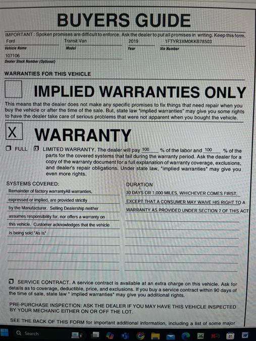 Car Revolution is pleased to be currently offering this 2019 Ford Transit Van with 50,043mi. This 2019 Ford Transit Van has such low mileage it has been parked more than driven. Driven by many, but adored by more, the Ford Transit Van is a perfect addition to any home. The Ford Transit Van will provide you with everything you have always wanted in a car -- Quality, Reliability, and Character. You could keep looking, but why? You've found the perfect vehicle right here. Car Revolution has been in business since 1998 with 2 locations and over 300 cars. A family owned business, focused and determined to extend hospitality to all our clients. We make every effort to present information that is accurate. However, it is based on data provided by the vehicle manufacturer and other sources. Therefore exact Configuration, Color, Certification and Accessories should be used as a guide only and are not guaranteed under any circumstances, for any inaccuracies, claims of losses of any nature. All advertised prices includes all cost to be paid by the consumer, except: Title, Taxes, Registration, License Fees, Insurance, Dealer Prep, Additional Options and include all applicable rebates. Subject to Credit Approval. Every effort is made in order to display accurate and current vehicle information, including Pricing. All vehicles are subjected to prior sale, removal and transport elsewhere, awaiting Title and Ownership Confirmation. Inventory is updated daily and subject to change. Not responsible for typographical errors or omissions. To better insure the specific vehicle's availability, call us right away at 856-316-3444 and feel free to ask any questions. EMG-WB