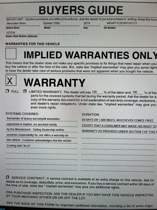 Car Revolution is honored to present a wonderful example of pure vehicle design... this 2019 Mercedes-Benz Sprinter Crew Van only has 113,652mi on it and could potentially be the vehicle of your dreams! This Mercedes-Benz includes: Optional Equipment: Safety and Security Active Brake Assist with Cross-Traffic Function predictive brake assist system Back-up alarm Blind Spot Assist Convenience Power door mirrors Heated driver and passenger side door mirrors Steering wheel mounted audio controls Power folding door mirrors Comfort Front plastic floor covering Mechanical Brake Assist Plus Active Brake Assist with Cross-Traffic Function predictive brake assist system MISFUELING PREVENTION FOR DIESEL Tires & Wheels All-season tires Exterior Electrically Folding Exterior Mirrors Power folding door mirrors Exterior mirror heated and electr. adjustable Power door mirrors Heated driver and passenger side door mirrors Rear doors, opening 270 degrees Split swing-out rear cargo door Interior Multifunction Steering Wheel Steering wheel mounted audio controls Parametric Special Module (PSM) Blind Spot Assist Blind Spot Assist Reversing warning device Back-up alarm FLOOR COVERING, PLASTIC Front plastic floor covering Engine AGM battery 12 V 95 Ah 850A *Note - For third party subscriptions or services, please contact the dealer for more information.* Today's luxury vehicle is not just about opulence. It's about a perfect balance of performance, comfort and attention to detail. This 2019 Mercedes-Benz Sprinter Crew Van is the perfect example of the modern luxury. Based on the superb condition of this vehicle, along with the options and color, this Mercedes-Benz Sprinter Crew Van is sure to sell fast. The quintessential Mercedes-Benz -- This Mercedes-Benz Sprinter Crew Van speaks volumes about its owner, about uncompromising individuality, a passion for driving and standards far above the ordinary. Car Revolution has been in business since 1998 with 2 locations and over 300 cars. A family owned business, focused and determined to extend hospitality to all our clients. We make every effort to present information that is accurate. However, it is based on data provided by the vehicle manufacturer and other sources. Therefore exact Configuration, Color, Certification and Accessories should be used as a guide only and are not guaranteed under any circumstances, for any inaccuracies, claims of losses of any nature. All advertised prices includes all cost to be paid by the consumer, except: Title, Taxes, Registration, License Fees, Insurance, Dealer Prep, Additional Options and include all applicable rebates. Subject to Credit Approval. Every effort is made in order to display accurate and current vehicle information, including Pricing. All vehicles are subjected to prior sale, removal and transport elsewhere, awaiting Title and Ownership Confirmation. Inventory is updated daily and subject to change. Not responsible for typographical errors or omissions. To better insure the specific vehicle's availability, call us right away at 856-316-3444 and feel free to ask any questions. EMG-WB You can find this 2019 Mercedes-Benz Sprinter Cargo Van and many others like it at Car Revolution. Pull up in the vehicle and the valet will want to parked on the front row. This Mercedes-Benz Sprinter Cargo Van is the vehicle others dream to own. Don't miss your chance to make it your new ride. This vehicle won't last long, take it home today. You can finally stop searching... You've found the one you've been looking for. There are many vehicles on the market but if you are looking for a vehicle that will perform as good as it looks then this Mercedes-Benz Sprinter Cargo Van is the one! Car Revolution has been in business since 1998 with 2 locations and over 300 cars. A family owned business, focused and determined to extend hospitality to all our clients. We make every effort to present information that is accurate. However, it is based on data provided by the vehicle manufacturer and other sources. Therefore exact Configuration, Color, Certification and Accessories should be used as a guide only and are not guaranteed under any circumstances, for any inaccuracies, claims of losses of any nature. All advertised prices includes all cost to be paid by the consumer, except: Title, Taxes, Registration, License Fees, Insurance, Dealer Prep, Additional Options and include all applicable rebates. Subject to Credit Approval. Every effort is made in order to display accurate and current vehicle information, including Pricing. All vehicles are subjected to prior sale, removal and transport elsewhere, awaiting Title and Ownership Confirmation. Inventory is updated daily and subject to change. Not responsible for typographical errors or omissions. To better insure the specific vehicle's availability, call us right away at 856-316-3444 and feel free to ask any questions. EMG-WB