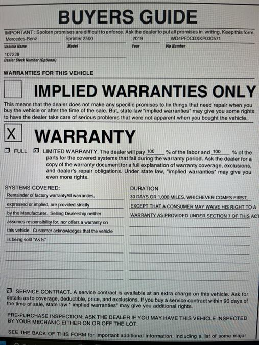 Check out this pre-owned 2019 Mercedes-Benz Sprinter Cargo Van we recently got in. This Mercedes-Benz includes: Optional Equipment: Safety and Security Active Brake Assist with Cross-Traffic Function predictive brake assist system Back-up alarm Blind Spot Assist Convenience Power door mirrors Heated driver and passenger side door mirrors Wood cargo area floor Steering wheel mounted audio controls Power folding door mirrors Mechanical Brake Assist Plus Active Brake Assist with Cross-Traffic Function predictive brake assist system MISFUELING PREVENTION FOR DIESEL Tires & Wheels TIRE BRAND - MICHELIN Specially Requested Tires Exterior Roof - High Electrically Folding Exterior Mirrors Power folding door mirrors Exterior Mirror - Power/Heated Power door mirrors Heated driver and passenger side door mirrors Rear Doors 270 Degree Opening Split swing-out rear cargo door Interior Parametric Special Module Blind Spot Monitoring Blind Spot Assist Rear Backup Alarm Back-up alarm Starter Upgraded WOOD FLOOR WITH 6 D-RINGS Wood cargo area floor Door Sill Protective Edge Entertainment Multifunction Steering Wheel Steering wheel mounted audio controls *Note - For third party subscriptions or services, please contact the dealer for more information.* In addition to being well-cared for, this Mercedes-Benz Sprinter Cargo Van has very low mileage making it a rare find. The Mercedes-Benz Sprinter Cargo Van will provide you with everything you have always wanted in a car -- Quality, Reliability, and Character. This is about the time when you're saying it is too good to be true, and let us be the one's to tell you, it is absolutely true. Car Revolution has been in business since 1998 with 2 locations and over 300 cars. A family owned business, focused and determined to extend hospitality to all our clients. We make every effort to present information that is accurate. However, it is based on data provided by the vehicle manufacturer and other sources. Therefore exact Configuration, Color, Certification and Accessories should be used as a guide only and are not guaranteed under any circumstances, for any inaccuracies, claims of losses of any nature. All advertised prices includes all cost to be paid by the consumer, except: Title, Taxes, Registration, License Fees, Insurance, Dealer Prep, Additional Options and include all applicable rebates. Subject to Credit Approval. Every effort is made in order to display accurate and current vehicle information, including Pricing. All vehicles are subjected to prior sale, removal and transport elsewhere, awaiting Title and Ownership Confirmation. Inventory is updated daily and subject to change. Not responsible for typographical errors or omissions. To better insure the specific vehicle's availability, call us right away at 856-316-3444 and feel free to ask any questions. EMG-WB You can find this 2019 Mercedes-Benz Sprinter Crew Van and many others like it at Car Revolution. This Mercedes-Benz Sprinter Crew Van is for the discerning driver who demands the utmost of his vehicle. In addition to being well-cared for, this Mercedes-Benz Sprinter Crew Van has very low mileage making it a rare find. The Mercedes-Benz Sprinter Crew Van will provide you with everything you have always wanted in a car -- Quality, Reliability, and Character. This is the one. Just what you've been looking for. Car Revolution has been in business since 1998 with 2 locations and over 300 cars. A family owned business, focused and determined to extend hospitality to all our clients. We make every effort to present information that is accurate. However, it is based on data provided by the vehicle manufacturer and other sources. Therefore exact Configuration, Color, Certification and Accessories should be used as a guide only and are not guaranteed under any circumstances, for any inaccuracies, claims of losses of any nature. All advertised prices includes all cost to be paid by the consumer, except: Title, Taxes, Registration, License Fees, Insurance, Dealer Prep, Additional Options and include all applicable rebates. Subject to Credit Approval. Every effort is made in order to display accurate and current vehicle information, including Pricing. All vehicles are subjected to prior sale, removal and transport elsewhere, awaiting Title and Ownership Confirmation. Inventory is updated daily and subject to change. Not responsible for typographical errors or omissions. To better insure the specific vehicle's availability, call us right away at 856-316-3444 and feel free to ask any questions. EMG-WB