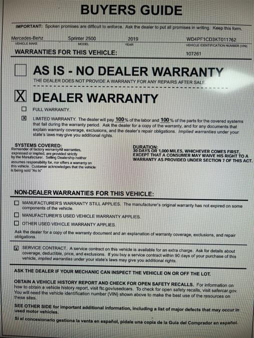 Check out this pre-owned 2019 Mercedes-Benz Sprinter Crew Van we recently got in. This Mercedes-Benz includes: Optional Equipment: Safety and Security Active Brake Assist with Cross-Traffic Function predictive brake assist system Back-up alarm Blind Spot Assist Convenience Power door mirrors Heated driver and passenger side door mirrors Steering wheel mounted audio controls Power folding door mirrors Comfort Front plastic floor covering Mechanical Brake Assist Plus Active Brake Assist with Cross-Traffic Function predictive brake assist system MISFUELING PREVENTION FOR DIESEL Tires & Wheels All-season tires Exterior Electrically Folding Exterior Mirrors Power folding door mirrors Exterior mirror heated and electr. adjustable Power door mirrors Heated driver and passenger side door mirrors Rear doors, opening 270 degrees Split swing-out rear cargo door Interior Multifunction Steering Wheel Steering wheel mounted audio controls Parametric Special Module (PSM) Blind Spot Assist Blind Spot Assist Reversing warning device Back-up alarm FLOOR COVERING, PLASTIC Front plastic floor covering Engine AGM battery 12 V 95 Ah 850A *Note - For third party subscriptions or services, please contact the dealer for more information.* The Mercedes-Benz Sprinter Crew Van 's pristine good looks were combined with the Mercedes-Benz high standard of excellence in order to make this a unique find. The Sprinter Crew Van is well maintained and has just 75,453mi. This low amount of miles makes this vehicle incomparable to the competition. Beautiful color combination with Blue Grey exterior over Black interior making this the one to own! Car Revolution has been in business since 1998 with 2 locations and over 300 cars. A family owned business, focused and determined to extend hospitality to all our clients. We make every effort to present information that is accurate. However, it is based on data provided by the vehicle manufacturer and other sources. Therefore exact Configuration, Color, Certification and Accessories should be used as a guide only and are not guaranteed under any circumstances, for any inaccuracies, claims of losses of any nature. All advertised prices includes all cost to be paid by the consumer, except: Title, Taxes, Registration, License Fees, Insurance, Dealer Prep, Additional Options and include all applicable rebates. Subject to Credit Approval. Every effort is made in order to display accurate and current vehicle information, including Pricing. All vehicles are subjected to prior sale, removal and transport elsewhere, awaiting Title and Ownership Confirmation. Inventory is updated daily and subject to change. Not responsible for typographical errors or omissions. To better insure the specific vehicle's availability, call us right away at 856-316-3444 and feel free to ask any questions. EMG-WB Thank you for visiting another one of Car Revolution's online listings! Please continue for more information on this 2019 Mercedes-Benz Sprinter Cargo Van with 75,453mi. This Mercedes-Benz Sprinter Cargo Van is for the discerning driver who demands the utmost of his vehicle. One of the best things about this Mercedes-Benz Sprinter Cargo Van is that it has low, low mileage. It's ready for you to truly break it in. There are many vehicles on the market but if you are looking for a vehicle that will perform as good as it looks then this Mercedes-Benz Sprinter Cargo Van is the one! This is about the time when you're saying it is too good to be true, and let us be the one's to tell you, it is absolutely true. Car Revolution has been in business since 1998 with 2 locations and over 300 cars. A family owned business, focused and determined to extend hospitality to all our clients. We make every effort to present information that is accurate. However, it is based on data provided by the vehicle manufacturer and other sources. Therefore exact Configuration, Color, Certification and Accessories should be used as a guide only and are not guaranteed under any circumstances, for any inaccuracies, claims of losses of any nature. All advertised prices includes all cost to be paid by the consumer, except: Title, Taxes, Registration, License Fees, Insurance, Dealer Prep, Additional Options and include all applicable rebates. Subject to Credit Approval. Every effort is made in order to display accurate and current vehicle information, including Pricing. All vehicles are subjected to prior sale, removal and transport elsewhere, awaiting Title and Ownership Confirmation. Inventory is updated daily and subject to change. Not responsible for typographical errors or omissions. To better insure the specific vehicle's availability, call us right away at 856-316-3444 and feel free to ask any questions. EMG-WB