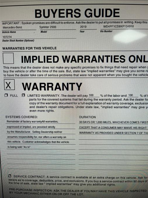 Car Revolution has a wide selection of exceptional pre-owned vehicles to choose from, including this 2019 Mercedes-Benz Sprinter 2500. This Mercedes-Benz includes: Optional Equipment: Safety and Security Active Brake Assist with Cross-Traffic Function predictive brake assist system Back-up alarm Blind Spot Assist Convenience Power door mirrors Heated driver and passenger side door mirrors Steering wheel mounted audio controls Power folding door mirrors Comfort Front plastic floor covering Mechanical Brake Assist Plus Active Brake Assist with Cross-Traffic Function predictive brake assist system MISFUELING PREVENTION FOR DIESEL Tires & Wheels All-season tires Exterior Electrically Folding Exterior Mirrors Power folding door mirrors Exterior mirror heated and electr. adjustable Power door mirrors Heated driver and passenger side door mirrors Rear doors, opening 270 degrees Split swing-out rear cargo door Interior Multifunction Steering Wheel Steering wheel mounted audio controls Parametric Special Module (PSM) Blind Spot Assist Blind Spot Assist Reversing warning device Back-up alarm FLOOR COVERING, PLASTIC Front plastic floor covering Engine AGM battery 12 V 95 Ah 850A *Note - For third party subscriptions or services, please contact the dealer for more information.* Pull up in the vehicle and the valet will want to parked on the front row. This Mercedes-Benz Sprinter 2500 High Roof V6 DIESEL EXT is the vehicle others dream to own. Don't miss your chance to make it your new ride. This 2019 Mercedes-Benz Sprinter 2500 has such low mileage it has been parked more than driven. The quintessential Mercedes-Benz -- This Mercedes-Benz Sprinter 2500 High Roof V6 DIESEL EXT speaks volumes about its owner, about uncompromising individuality, a passion for driving and standards far above the ordinary. Car Revolution has been in business since 1998 with 2 locations and over 300 cars. A family owned business, focused and determined to extend hospitality to all our clients. We make every effort to present information that is accurate. However, it is based on data provided by the vehicle manufacturer and other sources. Therefore exact Configuration, Color, Certification and Accessories should be used as a guide only and are not guaranteed under any circumstances, for any inaccuracies, claims of losses of any nature. All advertised prices includes all cost to be paid by the consumer, except: Title, Taxes, Registration, License Fees, Insurance, Dealer Prep, Additional Options and include all applicable rebates. Subject to Credit Approval. Every effort is made in order to display accurate and current vehicle information, including Pricing. All vehicles are subjected to prior sale, removal and transport elsewhere, awaiting Title and Ownership Confirmation. Inventory is updated daily and subject to change. Not responsible for typographical errors or omissions. To better insure the specific vehicle's availability, call us right away at 856-316-3444 and feel free to ask any questions. EMG-WB 2019Mercedes-BenzSprinter Cargo Van Quality and prestige abound with this Mercedes-Benz Sprinter Cargo Van . One of the best things about this Mercedes-Benz Sprinter Cargo Van is that it has low, low mileage. It's ready for you to truly break it in. Driven by many, but adored by more, the Mercedes-Benz Sprinter Cargo Van is a perfect addition to any home. This is the one. Just what you've been looking for. Car Revolution has been in business since 1998 with 2 locations and over 300 cars. A family owned business, focused and determined to extend hospitality to all our clients. We make every effort to present information that is accurate. However, it is based on data provided by the vehicle manufacturer and other sources. Therefore exact Configuration, Color, Certification and Accessories should be used as a guide only and are not guaranteed under any circumstances, for any inaccuracies, claims of losses of any nature. All advertised prices includes all cost to be paid by the consumer, except: Title, Taxes, Registration, License Fees, Insurance, Dealer Prep, Additional Options and include all applicable rebates. Subject to Credit Approval. Every effort is made in order to display accurate and current vehicle information, including Pricing. All vehicles are subjected to prior sale, removal and transport elsewhere, awaiting Title and Ownership Confirmation. Inventory is updated daily and subject to change. Not responsible for typographical errors or omissions. To better insure the specific vehicle's availability, call us right away at 856-316-3444 and feel free to ask any questions. EMG-WB