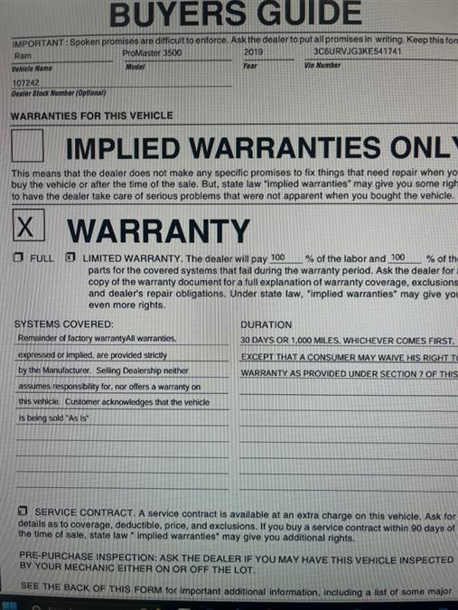 Looking for a clean, well-cared for 2019 Ram ProMaster 3500? This is it. This Ram includes: Optional Equipment: Safety and Security Daytime running lights Convenience Power door mirrors Heated driver and passenger side door mirrors Power folding door mirrors Exterior and Appearance Front license plate bracket Powertrain and Mechanical 70.00 mph speed limiter Exterior Daytime Running Headlamps Daytime running lights Front License Plate Bracket Front license plate bracket Power Folding/heated Mirrors Power door mirrors Heated driver and passenger side door mirrors Driver and passenger convex spotter mirrors Trailer style side mirrors Power folding door mirrors Turn signal indicator in door mirrors Black door mirrors Upfit Interface Connector Additional Options Quick Order Package 21A Interior Delete Inside Rear View Mirror Black Engine 70 Mph Maximum Speed 70.00 mph speed limiter *Note - For third party subscriptions or services, please contact the dealer for more information.* Opulent refinements married with exceptional engineering make this the kind of car you'll want to own for a lifetime. One of the best things about this Ram ProMaster 3500 is that it has low, low mileage. It's ready for you to truly break it in. Based on the superb condition of this vehicle, along with the options and color, this Ram ProMaster 3500 High Roof EXT is sure to sell fast. Car Revolution has been in business since 1998 with 2 locations and over 300 cars. A family owned business, focused and determined to extend hospitality to all our clients. We make every effort to present information that is accurate. However, it is based on data provided by the vehicle manufacturer and other sources. Therefore exact Configuration, Color, Certification and Accessories should be used as a guide only and are not guaranteed under any circumstances, for any inaccuracies, claims of losses of any nature. All advertised prices includes all cost to be paid by the consumer, except: Title, Taxes, Registration, License Fees, Insurance, Dealer Prep, Additional Options and include all applicable rebates. Subject to Credit Approval. Every effort is made in order to display accurate and current vehicle information, including Pricing. All vehicles are subjected to prior sale, removal and transport elsewhere, awaiting Title and Ownership Confirmation. Inventory is updated daily and subject to change. Not responsible for typographical errors or omissions. To better insure the specific vehicle's availability, call us right away at 856-316-3444 and feel free to ask any questions. EMG-WB Car Revolution has a wide selection of exceptional pre-owned vehicles to choose from, including this 2019 Ram ProMaster Cargo Van. Today's luxury vehicle is not just about opulence. It's about a perfect balance of performance, comfort and attention to detail. This 2019 Ram ProMaster Cargo Van is the perfect example of the modern luxury. It's not often you find just the vehicle you are looking for AND with low mileage. This is your chance to take home a pre-owned and barely driven Ram ProMaster Cargo Van. This is the one. Just what you've been looking for. This is about the time when you're saying it is too good to be true, and let us be the one's to tell you, it is absolutely true. Car Revolution has been in business since 1998 with 2 locations and over 300 cars. A family owned business, focused and determined to extend hospitality to all our clients. We make every effort to present information that is accurate. However, it is based on data provided by the vehicle manufacturer and other sources. Therefore exact Configuration, Color, Certification and Accessories should be used as a guide only and are not guaranteed under any circumstances, for any inaccuracies, claims of losses of any nature. All advertised prices includes all cost to be paid by the consumer, except: Title, Taxes, Registration, License Fees, Insurance, Dealer Prep, Additional Options and include all applicable rebates. Subject to Credit Approval. Every effort is made in order to display accurate and current vehicle information, including Pricing. All vehicles are subjected to prior sale, removal and transport elsewhere, awaiting Title and Ownership Confirmation. Inventory is updated daily and subject to change. Not responsible for typographical errors or omissions. To better insure the specific vehicle's availability, call us right away at 856-316-3444 and feel free to ask any questions. EMG-WB