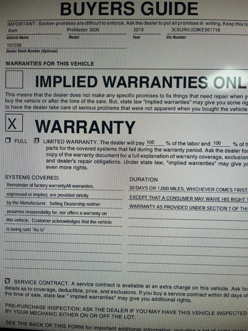 Thank you for your interest in one of Car Revolution's online offerings. Please continue for more information regarding this 2019 Ram ProMaster 3500 High Roof EXT with 119,635mi. This Ram includes: Optional Equipment: Safety and Security Daytime running lights Convenience Power door mirrors Heated driver and passenger side door mirrors Power folding door mirrors Exterior and Appearance Front license plate bracket Powertrain and Mechanical 70.00 mph speed limiter Exterior Daytime Running Headlamps Daytime running lights Front License Plate Bracket Front license plate bracket Power Folding/heated Mirrors Power door mirrors Heated driver and passenger side door mirrors Driver and passenger convex spotter mirrors Trailer style side mirrors Power folding door mirrors Turn signal indicator in door mirrors Black door mirrors Upfit Interface Connector Additional Options Quick Order Package 21A Interior Manufacturer's Statement of Origin Delete Inside Rear View Mirror Black Engine 70 Mph Maximum Speed 70.00 mph speed limiter *Note - For third party subscriptions or services, please contact the dealer for more information.* Excellence, luxury and stature are just a few of the pillars this car is built upon. Just what you've been looking for. With quality in mind, this vehicle is the perfect addition to take home. Beautiful color combination with Patriot Blue Pearlcoat exterior over Black interior making this the one to own! Car Revolution has been in business since 1998 with 2 locations and over 300 cars. A family owned business, focused and determined to extend hospitality to all our clients. We make every effort to present information that is accurate. However, it is based on data provided by the vehicle manufacturer and other sources. Therefore exact Configuration, Color, Certification and Accessories should be used as a guide only and are not guaranteed under any circumstances, for any inaccuracies, claims of losses of any nature. All advertised prices includes all cost to be paid by the consumer, except: Title, Taxes, Registration, License Fees, Insurance, Dealer Prep, Additional Options and include all applicable rebates. Subject to Credit Approval. Every effort is made in order to display accurate and current vehicle information, including Pricing. All vehicles are subjected to prior sale, removal and transport elsewhere, awaiting Title and Ownership Confirmation. Inventory is updated daily and subject to change. Not responsible for typographical errors or omissions. To better insure the specific vehicle's availability, call us right away at 856-316-3444 and feel free to ask any questions. EMG-WB Car Revolution has a wide selection of exceptional pre-owned vehicles to choose from, including this 2019 Ram ProMaster Cargo Van. Excellence, luxury and stature are just a few of the pillars this car is built upon. You could keep looking, but why? You've found the perfect vehicle right here. This Blue Ram is clean and shiny exterior makes it look like it came straight from the factory. This is about the time when you're saying it is too good to be true, and let us be the one's to tell you, it is absolutely true. Car Revolution has been in business since 1998 with 2 locations and over 300 cars. A family owned business, focused and determined to extend hospitality to all our clients. We make every effort to present information that is accurate. However, it is based on data provided by the vehicle manufacturer and other sources. Therefore exact Configuration, Color, Certification and Accessories should be used as a guide only and are not guaranteed under any circumstances, for any inaccuracies, claims of losses of any nature. All advertised prices includes all cost to be paid by the consumer, except: Title, Taxes, Registration, License Fees, Insurance, Dealer Prep, Additional Options and include all applicable rebates. Subject to Credit Approval. Every effort is made in order to display accurate and current vehicle information, including Pricing. All vehicles are subjected to prior sale, removal and transport elsewhere, awaiting Title and Ownership Confirmation. Inventory is updated daily and subject to change. Not responsible for typographical errors or omissions. To better insure the specific vehicle's availability, call us right away at 856-316-3444 and feel free to ask any questions. EMG-WB