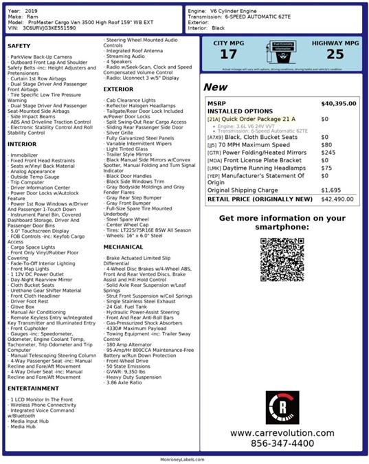 This 2019 Ram ProMaster Cargo Van is proudly offered by Car Revolution Today's luxury vehicle is not just about opulence. It's about a perfect balance of performance, comfort and attention to detail. This 2019 Ram ProMaster Cargo Van is the perfect example of the modern luxury. Low, low mileage coupled with an exacting maintenance program make this vehicle a rare find. The quintessential Ram -- This Ram ProMaster Cargo Van speaks volumes about its owner, about uncompromising individuality, a passion for driving and standards far above the ordinary. Based on the superb condition of this vehicle, along with the options and color, this Ram ProMaster Cargo Van is sure to sell fast. Car Revolution has been in business since 1998 with 2 locations and over 300 cars. A family owned business, focused and determined to extend hospitality to all our clients. We make every effort to present information that is accurate. However, it is based on data provided by the vehicle manufacturer and other sources. Therefore exact Configuration, Color, Certification and Accessories should be used as a guide only and are not guaranteed under any circumstances, for any inaccuracies, claims of losses of any nature. All advertised prices includes all cost to be paid by the consumer, except: Title, Taxes, Registration, License Fees, Insurance, Dealer Prep, Additional Options and include all applicable rebates. Subject to Credit Approval. Every effort is made in order to display accurate and current vehicle information, including Pricing. All vehicles are subjected to prior sale, removal and transport elsewhere, awaiting Title and Ownership Confirmation. Inventory is updated daily and subject to change. Not responsible for typographical errors or omissions. To better insure the specific vehicle's availability, call us right away at 856-316-3444 and feel free to ask any questions. EMG-WB