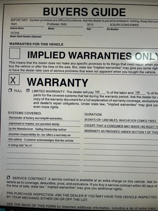 Car Revolution has a wide selection of exceptional pre-owned vehicles to choose from, including this 2019 Ram ProMaster 3500. This Ram includes: Optional Equipment: Safety and Security Daytime running lights Convenience Power door mirrors Heated driver and passenger side door mirrors Power folding door mirrors Exterior and Appearance Front license plate bracket Powertrain and Mechanical 70.00 mph speed limiter Exterior Daytime Running Headlamps Daytime running lights Front License Plate Bracket Front license plate bracket Power Folding/heated Mirrors Power door mirrors Heated driver and passenger side door mirrors Driver and passenger convex spotter mirrors Trailer style side mirrors Power folding door mirrors Turn signal indicator in door mirrors Black door mirrors Upfit Interface Connector Additional Options Quick Order Package 21A Interior Manufacturer's Statement of Origin Delete Inside Rear View Mirror Black Engine 70 Mph Maximum Speed 70.00 mph speed limiter *Note - For third party subscriptions or services, please contact the dealer for more information.* Is it possible to fall in love with a vehicle? It is when your vehicle is as prestige as the Ram ProMaster 3500. There are many vehicles on the market but if you are looking for a vehicle that will perform as good as it looks then this Ram ProMaster 3500 High Roof EXT is the one! Driven by many, but adored by more, the Ram ProMaster 3500 High Roof EXT is a perfect addition to any home. Car Revolution has been in business since 1998 with 2 locations and over 300 cars. A family owned business, focused and determined to extend hospitality to all our clients. We make every effort to present information that is accurate. However, it is based on data provided by the vehicle manufacturer and other sources. Therefore exact Configuration, Color, Certification and Accessories should be used as a guide only and are not guaranteed under any circumstances, for any inaccuracies, claims of losses of any nature. All advertised prices includes all cost to be paid by the consumer, except: Title, Taxes, Registration, License Fees, Insurance, Dealer Prep, Additional Options and include all applicable rebates. Subject to Credit Approval. Every effort is made in order to display accurate and current vehicle information, including Pricing. All vehicles are subjected to prior sale, removal and transport elsewhere, awaiting Title and Ownership Confirmation. Inventory is updated daily and subject to change. Not responsible for typographical errors or omissions. To better insure the specific vehicle's availability, call us right away at 856-316-3444 and feel free to ask any questions. EMG-WB Thank you for visiting another one of Car Revolution's online listings! Please continue for more information on this 2019 Ram ProMaster Cargo Van with 100,351mi. Today's luxury vehicle is not just about opulence. It's about a perfect balance of performance, comfort and attention to detail. This 2019 Ram ProMaster Cargo Van is the perfect example of the modern luxury. You can finally stop searching... You've found the one you've been looking for. You've found the one you've been looking for. Your dream car. Based on the superb condition of this vehicle, along with the options and color, this Ram ProMaster Cargo Van is sure to sell fast. Car Revolution has been in business since 1998 with 2 locations and over 300 cars. A family owned business, focused and determined to extend hospitality to all our clients. We make every effort to present information that is accurate. However, it is based on data provided by the vehicle manufacturer and other sources. Therefore exact Configuration, Color, Certification and Accessories should be used as a guide only and are not guaranteed under any circumstances, for any inaccuracies, claims of losses of any nature. All advertised prices includes all cost to be paid by the consumer, except: Title, Taxes, Registration, License Fees, Insurance, Dealer Prep, Additional Options and include all applicable rebates. Subject to Credit Approval. Every effort is made in order to display accurate and current vehicle information, including Pricing. All vehicles are subjected to prior sale, removal and transport elsewhere, awaiting Title and Ownership Confirmation. Inventory is updated daily and subject to change. Not responsible for typographical errors or omissions. To better insure the specific vehicle's availability, call us right away at 856-316-3444 and feel free to ask any questions. EMG-WB