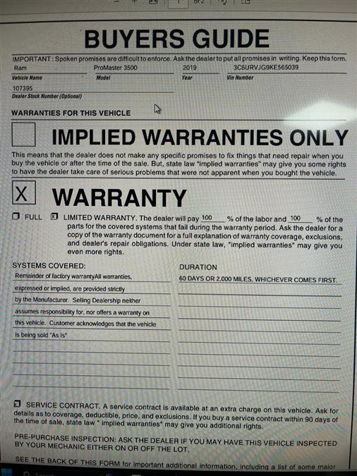 Car Revolution has a wide selection of exceptional pre-owned vehicles to choose from, including this 2019 Ram ProMaster 3500. This Ram includes: Optional Equipment: Exterior and Appearance Non-metallic paint Front license plate bracket Exterior Front License Plate Bracket Front license plate bracket Upfit Interface Connector Additional Options Quick Order Package 21A Interior Additional Key Fobs (2) Black Paint Bright White Clearcoat Non-metallic paint *Note - For third party subscriptions or services, please contact the dealer for more information.* Indulge yourself with one of the most highly crafted, most luxurious automobiles available today. Beautiful color combination with Bright White Clearcoat exterior over Black interior making this the one to own! There is no reason why you shouldn't buy this Ram ProMaster 3500 High Roof EXT. It is incomparable for the price and quality. Car Revolution has been in business since 1998 with 2 locations and over 300 cars. A family owned business, focused and determined to extend hospitality to all our clients. We make every effort to present information that is accurate. However, it is based on data provided by the vehicle manufacturer and other sources. Therefore exact Configuration, Color, Certification and Accessories should be used as a guide only and are not guaranteed under any circumstances, for any inaccuracies, claims of losses of any nature. All advertised prices includes all cost to be paid by the consumer, except: Title, Taxes, Registration, License Fees, Insurance, Dealer Prep, Additional Options and include all applicable rebates. Subject to Credit Approval. Every effort is made in order to display accurate and current vehicle information, including Pricing. All vehicles are subjected to prior sale, removal and transport elsewhere, awaiting Title and Ownership Confirmation. Inventory is updated daily and subject to change. Not responsible for typographical errors or omissions. To better insure the specific vehicle's availability, call us right away at 856-316-3444 and feel free to ask any questions. EMG-WB This outstanding example of a 2019 Ram ProMaster Cargo Van is offered by Car Revolution. This Ram ProMaster Cargo Van 's level of quality is not meant for just anyone. It's meant for the person who strives for a classy, comfortable, and luxurious car. Look no further, you have found exactly what you've been looking for. The Ram ProMaster Cargo Van will provide you with everything you have always wanted in a car -- Quality, Reliability, and Character. This is the one. Just what you've been looking for. Car Revolution has been in business since 1998 with 2 locations and over 300 cars. A family owned business, focused and determined to extend hospitality to all our clients. We make every effort to present information that is accurate. However, it is based on data provided by the vehicle manufacturer and other sources. Therefore exact Configuration, Color, Certification and Accessories should be used as a guide only and are not guaranteed under any circumstances, for any inaccuracies, claims of losses of any nature. All advertised prices includes all cost to be paid by the consumer, except: Title, Taxes, Registration, License Fees, Insurance, Dealer Prep, Additional Options and include all applicable rebates. Subject to Credit Approval. Every effort is made in order to display accurate and current vehicle information, including Pricing. All vehicles are subjected to prior sale, removal and transport elsewhere, awaiting Title and Ownership Confirmation. Inventory is updated daily and subject to change. Not responsible for typographical errors or omissions. To better insure the specific vehicle's availability, call us right away at 856-316-3444 and feel free to ask any questions. EMG-WB