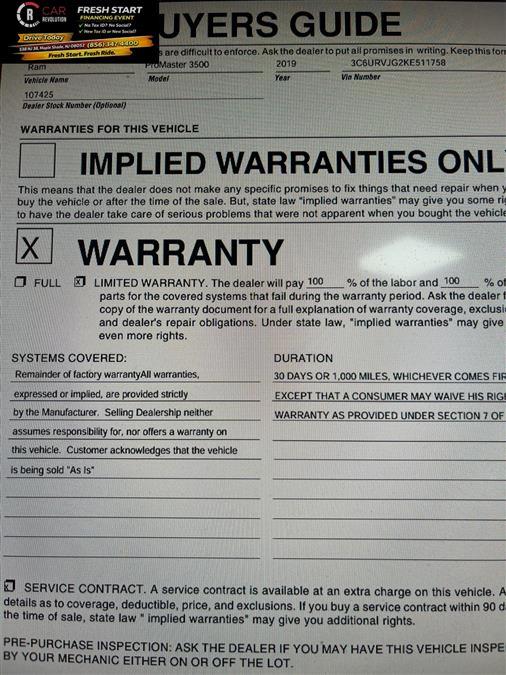 Contact Car Revolution today for information on dozens of vehicles like this 2019 Ram ProMaster 3500 High Roof EXT. This Ram includes: Optional Equipment: Safety and Security ParkSense rear parking sensors Convenience Power door mirrors Heated driver and passenger side door mirrors Locking glove box Front under seat tray Cargo net Cruise control 2 12V power outlets Upfitter switches Comfort Seating capacity - 3 Vinyl front seat upholstery Exterior and Appearance Non-metallic paint Manual extendable trailer mirrors Trailer wiring harness Class IV tow rating Trailer hitch Front license plate bracket Seating Vinyl Bucket Seats Bucket front seats Vinyl front seat upholstery Passenger Double Seat Seating capacity - 3 Driver bucket and passenger bench seat Split-bench front seat Underseat Storage Tray Front under seat tray Powertrain and Mechanical Heavy-duty rear anti-roll bar Exterior Front License Plate Bracket Front license plate bracket Wide Power Heated Mirrors Power door mirrors Heated driver and passenger side door mirrors Driver and passenger convex spotter mirrors Manual extendable trailer mirrors Manual folding door mirrors Turn signal indicator in door mirrors Black door mirrors Upfit Interface Connector 96 Wide Exterior Mirrors Manual extendable trailer mirrors Additional Options Interior Convenience Group Locking glove box Front under seat tray Cargo net Quick Order Package 21A MOPAR Trailer Tow Group Trailer wiring harness Class IV tow rating Trailer hitch Premium Heavy Duty Suspension Heavy-duty rear anti-roll bar 12V Rear Auxiliary Power Outlet 2 12V power outlets Interior Additional Key Fobs (2) Auxiliary Switches Upfitter switches ParkSense Rear Park Assist System ParkSense rear parking sensors Speed Control Cruise control Cargo Net Cargo net Shelf Above Roof Trim Locking Glove Box Locking glove box GPS Navigation Black Engine 220 Amp Alternator Alternator Entertainment Uconnect 3 Navigation Radio with 5 Display 5 inch primary display Integrated navigation system with voice activation Bluetooth handsfree wireless device connectivity AM/FM/satellite prep GPS Antenna Input Paint Bright White Clearcoat Non-metallic paint Trailering MOPAR 7 and 4 Pin Wiring Harness Trailer wiring harness Class IV Receiver Hitch Class IV tow rating Trailer hitch Technology and Telematics Integrated navigation system with voice activation Suspension Rear Heavy Duty Stabilizer Bar Heavy-duty rear anti-roll bar *Note - For third party subscriptions or services, please contact the dealer for more information.* Today's luxury vehicle is not just about opulence. It's about a perfect balance of performance, comfort and attention to detail. This 2019 Ram ProMaster 3500 High Roof EXT is the perfect example of the modern luxury. Exceptional in every sense of the word, this incredibly low mileage vehicle is one of a kind. You've found the one you've been looking for. Your dream car. Car Revolution has been in business since 1998 with 2 locations and over 300 cars. A family owned business, focused and determined to extend hospitality to all our clients. We make every effort to present information that is accurate. However, it is based on data provided by the vehicle manufacturer and other sources. Therefore exact Configuration, Color, Certification and Accessories should be used as a guide only and are not guaranteed under any circumstances, for any inaccuracies, claims of losses of any nature. All advertised prices includes all cost to be paid by the consumer, except: Title, Taxes, Registration, License Fees, Insurance, Dealer Prep, Additional Options and include all applicable rebates. Subject to Credit Approval. Every effort is made in order to display accurate and current vehicle information, including Pricing. All vehicles are subjected to prior sale, removal and transport elsewhere, awaiting Title and Ownership Confirmation. Inventory is updated daily and subject to change. Not responsible for typographical errors or omissions. To better insure the specific vehicle's availability, call us right away at 856-316-3444 and feel free to ask any questions. EMG-WB Thank you for your interest in one of Car Revolution's online offerings. Please continue for more information regarding this 2019 Ram ProMaster Cargo Van with 62,214mi. Opulent refinements married with exceptional engineering make this the kind of car you'll want to own for a lifetime. This 2019 Ram ProMaster Cargo Van has such low mileage it has been parked more than driven. Driven by many, but adored by more, the Ram ProMaster Cargo Van is a perfect addition to any home. The Ram ProMaster Cargo Van will provide you with everything you have always wanted in a car -- Quality, Reliability, and Character. Car Revolution has been in business since 1998 with 2 locations and over 300 cars. A family owned business, focused and determined to extend hospitality to all our clients. We make every effort to present information that is accurate. However, it is based on data provided by the vehicle manufacturer and other sources. Therefore exact Configuration, Color, Certification and Accessories should be used as a guide only and are not guaranteed under any circumstances, for any inaccuracies, claims of losses of any nature. All advertised prices includes all cost to be paid by the consumer, except: Title, Taxes, Registration, License Fees, Insurance, Dealer Prep, Additional Options and include all applicable rebates. Subject to Credit Approval. Every effort is made in order to display accurate and current vehicle information, including Pricing. All vehicles are subjected to prior sale, removal and transport elsewhere, awaiting Title and Ownership Confirmation. Inventory is updated daily and subject to change. Not responsible for typographical errors or omissions. To better insure the specific vehicle's availability, call us right away at 856-316-3444 and feel free to ask any questions. EMG-WB