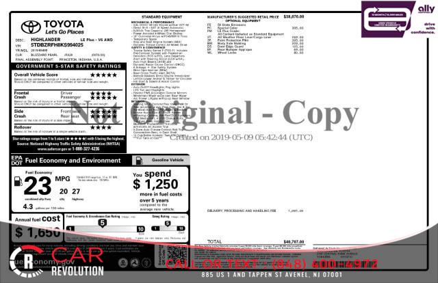 Check out this pre-owned 2019 Toyota Highlander we recently got in. The Toyota Highlander LE offers a fair amount of utility thanks to its advanced features and unique styling. It's also quite sporty, and injects an ample amount of handling chutzpah into the ridin'-high body of a family-friendly SUV. This Toyota Highlander LE is equipped with AWD for improved handling. Whether you're faced with inclement weather or just out enjoying the twisting back road, you'll have the grip of AWD on your side. The Highlander LE is well maintained and has just 80,052mi. This low amount of miles makes this vehicle incomparable to the competition. Just what you've been looking for. With quality in mind, this vehicle is the perfect addition to take home. Car Revolution has been in business since 1998 with 2 locations and over 300 cars. A family owned business, focused and determined to extend hospitality to all our clients. We make every effort to present information that is accurate. However, it is based on data provided by the vehicle manufacturer and other sources. Therefore exact Configuration, Color, Certification and Accessories should be used as a guide only and are not guaranteed under any circumstances, for any inaccuracies, claims of losses of any nature. All advertised prices includes all cost to be paid by the consumer, except: Title, Taxes, Registration, License Fees, Insurance, Dealer Prep, Additional Options and include all applicable rebates. Subject to Credit Approval. Every effort is made in order to display accurate and current vehicle information, including Pricing. All vehicles are subjected to prior sale, removal and transport elsewhere, awaiting Title and Ownership Confirmation. Inventory is updated daily and subject to change. Not responsible for typographical errors or omissions. To better insure the specific vehicle's availability, call us right away at 732-527-0477 and feel free to ask any questions. EMG-WB