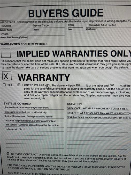 Standard Equipments on 2020 Chevrolet Express Cargo Work Van 2500 in Maple Shade, NJ