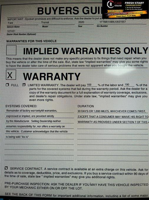 Contact Car Revolution today for information on dozens of vehicles like this 2020 Ford Transit-250 Cargo Van . This Ford includes: Optional Equipment: Safety and Security Daytime running lights Back-up alarm Safety BACK UP ALARM Back-up alarm Convenience Vinyl/rubber cargo area floor Plastic trunk lid trim Cruise Control w/Adjustable Speed Limiting Device (ASLD) cruise control with steering wheel mounted controls Comfort Full vinyl floor covering Full floor coverage Exterior FRONT LICENSE PLATE BRACKET Front license plate bracket DAYTIME RUNNING LAMPS Daytime running lights Additional Options Order Code 101A SHIP-THRU NATIONAL FLEET SVCS Interior CRUISE CONTROL Cruise Control w/Adjustable Speed Limiting Device (ASLD) cruise control with steering wheel mounted controls D-PILLAR ASSIST HANDLES .VINYL F/R FLOOR COVERING Full vinyl floor covering Vinyl/rubber cargo area floor Full floor coverage LOAD AREA PROTECTION PKG Plastic trunk lid trim DARK PALAZZO GRAY VINYL Engine SPEED LIMIT DEVICE (75 MPH) *Note - For third party subscriptions or services, please contact the dealer for more information.* Is it possible to fall in love with a vehicle? It is when your vehicle is as prestige as the Ford Transit-250 Cargo Van. Exceptional in every sense of the word, this incredibly low mileage vehicle is one of a kind. Just what you've been looking for. With quality in mind, this vehicle is the perfect addition to take home. Car Revolution has been in business since 1998 with 2 locations and over 300 cars. A family owned business, focused and determined to extend hospitality to all our clients. We make every effort to present information that is accurate. However, it is based on data provided by the vehicle manufacturer and other sources. Therefore exact Configuration, Color, Certification and Accessories should be used as a guide only and are not guaranteed under any circumstances, for any inaccuracies, claims of losses of any nature. All advertised prices includes all cost to be paid by the consumer, except: Title, Taxes, Registration, License Fees, Insurance, Dealer Prep, Additional Options and include all applicable rebates. Subject to Credit Approval. Every effort is made in order to display accurate and current vehicle information, including Pricing. All vehicles are subjected to prior sale, removal and transport elsewhere, awaiting Title and Ownership Confirmation. Inventory is updated daily and subject to change. Not responsible for typographical errors or omissions. To better insure the specific vehicle's availability, call us right away at 856-316-3444 and feel free to ask any questions. EMG-WB This 2020 Ford Transit Cargo Van is proudly offered by Car Revolution Today's luxury vehicle is not just about opulence. It's about a perfect balance of performance, comfort and attention to detail. This 2020 Ford Transit Cargo Van is the perfect example of the modern luxury. Low, low mileage coupled with an exacting maintenance program make this vehicle a rare find. The Ford Transit Cargo Van will provide you with everything you have always wanted in a car -- Quality, Reliability, and Character. This is about the time when you're saying it is too good to be true, and let us be the one's to tell you, it is absolutely true. Car Revolution has been in business since 1998 with 2 locations and over 300 cars. A family owned business, focused and determined to extend hospitality to all our clients. We make every effort to present information that is accurate. However, it is based on data provided by the vehicle manufacturer and other sources. Therefore exact Configuration, Color, Certification and Accessories should be used as a guide only and are not guaranteed under any circumstances, for any inaccuracies, claims of losses of any nature. All advertised prices includes all cost to be paid by the consumer, except: Title, Taxes, Registration, License Fees, Insurance, Dealer Prep, Additional Options and include all applicable rebates. Subject to Credit Approval. Every effort is made in order to display accurate and current vehicle information, including Pricing. All vehicles are subjected to prior sale, removal and transport elsewhere, awaiting Title and Ownership Confirmation. Inventory is updated daily and subject to change. Not responsible for typographical errors or omissions. To better insure the specific vehicle's availability, call us right away at 856-316-3444 and feel free to ask any questions. EMG-WB