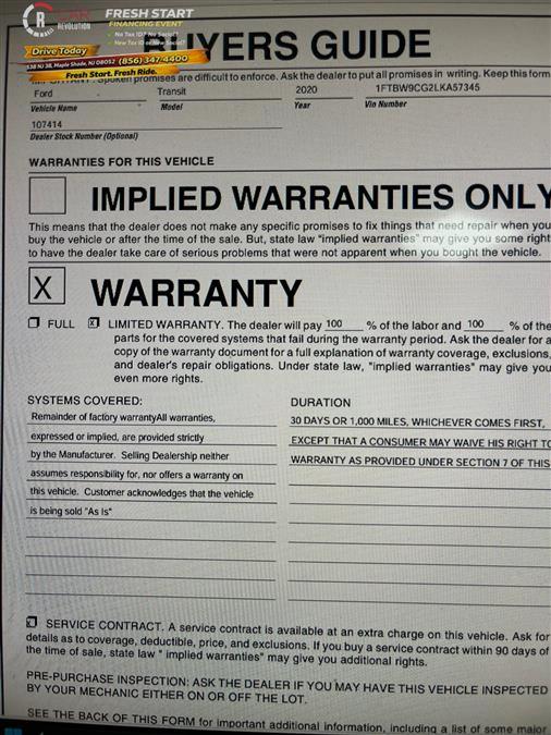 This 2020 Ford Transit T350 MED ROOF 148 is offered to you for sale by Car Revolution. This Ford includes: Optional Equipment: Safety and Security Back-up alarm Security system Turn signal indicator in door mirrors Rear parking sensors Front fog lights Safety PERIMETER ANTI-THEFT ALARM Security system BACK UP ALARM Back-up alarm Convenience Heated driver and passenger side door mirrors Cruise Control w/Adjustable Speed Limiting Device (ASLD) cruise control with steering wheel mounted controls Exterior and Appearance Non-metallic paint Trailer style side mirrors Powertrain and Mechanical Premium unleaded Dual alternator Dual lead acid batteries Auto stop-start engine Mechanical limited slip differential EcoBoost 3.5L V-6 gasoline direct injection, DOHC, variable valve control, twin turbo, premium unleaded, engine with 310HP EcoBoost 3.5L V-6 DOHC EcoBoost V6 Twin turbo Tires & Wheels 16 Silver Steel Wheels with Exposed Lug Nuts 16 x 6.5-inch front and rear argent steel wheels Exterior FRONT FOG LAMPS Front fog lights LONG-ARM PWR HEAT MIRRORS Power door mirrors Heated driver and passenger side door mirrors Trailer style side mirrors Manual folding door mirrors Turn signal indicator in door mirrors SCUFF PLATE KIT Additional Options Order Code 101A PARTIAL GAS FILL In-car Entertainment 8 inch primary display Primary monitor touchscreen Interior CRUISE CONTROL Cruise Control w/Adjustable Speed Limiting Device (ASLD) cruise control with steering wheel mounted controls AUXILIARY FUSE PANEL MODIFIED VEHICLE WIRING SYS 2 ADDITIONAL KEYS Keyfob keyless entry All-in-one remote fob and ignition key REVERSE SENSING SYSTEM Rear parking sensors DARK PALAZZO GRAY VINYL Engine 3.5L ECOBOOST V6 (GAS) Front mounted engine Premium unleaded Spark ignition system Longitudinal mounted engine Aluminum engine block Aluminum cylinder head Auto stop-start engine EcoBoost 3.5L V-6 gasoline direct injection, DOHC, variable valve control, twin turbo, premium unleaded, engine with 310HP EcoBoost 3.5L V-6 DOHC EcoBoost V6 Twin turbo Wheel hub covers 16 x 6.5-inch front and rear argent steel wheels DUAL ALTERNATORS (250 AMP) Dual alternator DUAL BATTERIES (70 AMP-HR) Dual lead acid batteries Entertainment RADIO - SYNC3 8 SCRN 1 total number of 1st row displays 8 inch primary display Primary monitor touchscreen 911 Assist emergency SOS system via mobile device SYNC 3 AppLink/Apple CarPlay/Android Auto smart device app link 2 USB ports AM/FM SYNC 3 Communications and Entertainment System 911 Assist emergency SOS system via mobile device SYNC 3 AppLink/Apple CarPlay/Android Auto smart device app link 2 USB ports Paint OXFORD WHITE Non-metallic paint Technology and Telematics 911 Assist emergency SOS system via mobile device SYNC 3 AppLink/Apple CarPlay/Android Auto smart device app link Suspension 3.73 LIMITED SLIP AXLE Mechanical limited slip differential HEAVY DUTY FRONT AXLE *Note - For third party subscriptions or services, please contact the dealer for more information.* Just what you've been looking for. With quality in mind, this vehicle is the perfect addition to take home. You can finally stop searching... You've found the one you've been looking for. Based on the superb condition of this vehicle, along with the options and color, this Ford Transit T350 MED ROOF 148 is sure to sell fast. Car Revolution has been in business since 1998 with 2 locations and over 300 cars. A family owned business, focused and determined to extend hospitality to all our clients. We make every effort to present information that is accurate. However, it is based on data provided by the vehicle manufacturer and other sources. Therefore exact Configuration, Color, Certification and Accessories should be used as a guide only and are not guaranteed under any circumstances, for any inaccuracies, claims of losses of any nature. All advertised prices includes all cost to be paid by the consumer, except: Title, Taxes, Registration, License Fees, Insurance, Dealer Prep, Additional Options and include all applicable rebates. Subject to Credit Approval. Every effort is made in order to display accurate and current vehicle information, including Pricing. All vehicles are subjected to prior sale, removal and transport elsewhere, awaiting Title and Ownership Confirmation. Inventory is updated daily and subject to change. Not responsible for typographical errors or omissions. To better insure the specific vehicle's availability, call us right away at 856-316-3444 and feel free to ask any questions. EMG-WB Thank you for your interest in one of Car Revolution's online offerings. Please continue for more information regarding this 2020 Ford Transit Cargo Van with 85,295mi. This is about the time when you're saying it is too good to be true, and let us be the one's to tell you, it is absolutely true. You can finally stop searching... You've found the one you've been looking for. There is no reason why you shouldn't buy this Ford Transit Cargo Van . It is incomparable for the price and quality. This is the one. Just what you've been looking for. Car Revolution has been in business since 1998 with 2 locations and over 300 cars. A family owned business, focused and determined to extend hospitality to all our clients. We make every effort to present information that is accurate. However, it is based on data provided by the vehicle manufacturer and other sources. Therefore exact Configuration, Color, Certification and Accessories should be used as a guide only and are not guaranteed under any circumstances, for any inaccuracies, claims of losses of any nature. All advertised prices includes all cost to be paid by the consumer, except: Title, Taxes, Registration, License Fees, Insurance, Dealer Prep, Additional Options and include all applicable rebates. Subject to Credit Approval. Every effort is made in order to display accurate and current vehicle information, including Pricing. All vehicles are subjected to prior sale, removal and transport elsewhere, awai