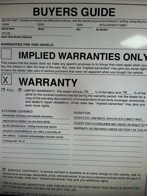 Car Revolution is pleased to be currently offering this 2020 INFINITI QX50 ESSENTIAL AWD with 69,957mi. This INFINITI includes: Optional Equipment: Safety and Security Directionally adaptive headlights Remote activated perimeter approach lighting with puddle lights Lane Departure Prevention (LDP) Blind Spot Intervention (BSI) Distance Control Assist (DCA) Interior Cargo Package Carpet and rubber cargo mat Cargo net Welcome Lighting Remote activated perimeter approach lighting with puddle lights Illuminated entry Edition 30 Floor Mats Carpet front and rear secondary floor mats Literature Kit Graphite Blind Spot Intervention Blind Spot Intervention (BSI) Intelligent Cruise Control Cruise control with steering wheel mounted controls Intelligent Cruise Control (ICC) w/Distance Control Assist (DCA) Distance Control Assist Distance Control Assist (DCA) Dark Chrome Front Fender Accent Graphite Tricot Headliner Cloth headliner material Edition 30 Labeled Illuminated Kick Plates Illuminated sill plates Lane Departure Prevention Lane Departure Prevention (LDP) Dark Chrome Tailgate Finisher Convenience Carpet and rubber cargo mat Cargo net Intelligent Cruise Control (ICC) w/Distance Control Assist (DCA) Illuminated sill plates Comfort Carpet front and rear secondary floor mats Exterior and Appearance Dark chrome grille Metallic paint Exterior badging 20 x 8.5-inch front and rear painted aluminum wheels P255/45VR20 run-flat AS BSW front and rear tires Front splash guards Rear splash guards Black door mirrors Body-colored rear bumper insert Paint Graphite Shadow Metallic paint Emissions 50 State Emissions LEV3-ULEV70 emissions Tier 3 Bin 70 emissions Tires & Wheels P255/45R20 All-Season Run-Flat Tires P255/45VR20 run-flat AS BSW front and rear tires 20 Dark Painted Wheels 20 x 8.5-inch front and rear painted aluminum wheels Exterior Splash Guards (set of 4) Front splash guards Rear splash guards Edition 30 Badge on Lower Right Tailgate Exterior badging Black Outside Mirror Caps Black door mirrors Black Front Grille Mesh Dark chrome grille Dark Chrome Front Grille Surround Dark chrome grille Active Front Lighting System Directionally adaptive headlights Body Color Rear Diffuser Body-colored rear bumper insert Cube Design LED Headlights Projector beam headlights LED low and high beam headlights Multiple enclosed headlights Additional Options Edition 30 Package Dark chrome grille Exterior badging Cloth headliner material Black door mirrors Body-colored rear bumper insert Illuminated sill plates ProASSIST Package (edition 30) Projector beam headlights LED low and high beam headlights Multiple enclosed headlights Directionally adaptive headlights Cruise control with steering wheel mounted controls Intelligent Cruise Control (ICC) w/Distance Control Assist (DCA) Lane Departure Prevention (LDP) Blind Spot Intervention (BSI) Distance Control Assist (DCA) *Note - For third party subscriptions or services, please contact the dealer for more information.* This versatile SUV is perfect for families or contractors with its oversized cargo area, exceptional horsepower and option upgrades. Indulge yourself with one of the most highly crafted, most luxurious automobiles available today. This vehicle has an added performance bonus: AWD. It improves handling on those winding back roads, and gives you added safety and control when driving through wet and snow weather conditions. A INFINITI with as few miles as this one is a rare find. This QX50 ESSENTIAL AWD was gently driven and it shows. Car Revolution has been in business since 1998 with 2 locations and over 300 cars. A family owned business, focused and determined to extend hospitality to all our clients. We make every effort to present information that is accurate. However, it is based on data provided by the vehicle manufacturer and other sources. Therefore exact Configuration, Color, Certification and Accessories should be used as a guide only and are not guaranteed under any circumstances, for any inaccuracies, claims of losses of any nature. All advertised prices includes all cost to be paid by the consumer, except: Title, Taxes, Registration, License Fees, Insurance, Dealer Prep, Additional Options and include all applicable rebates. Subject to Credit Approval. Every effort is made in order to display accurate and current vehicle information, including Pricing. All vehicles are subjected to prior sale, removal and transport elsewhere, awaiting Title and Ownership Confirmation. Inventory is updated daily and subject to change. Not responsible for typographical errors or omissions. To better insure the specific vehicle's availability, call us right away at 856-316-3444 and feel free to ask any questions. EMG-WB This 2020 INFINITI QX50 ESSENTIAL is offered to you for sale by Car Revolution. Off-road or on the street, this INFINITI QX50 ESSENTIAL handles with ease. There's a level of quality and refinement in this INFINITI QX50 ESSENTIAL that you won't find in your average vehicle. Savor the satisfaction of safety in any condition with this AWD INFINITI QX50. Superior acceleration, unmatched traction and stability as well as a luxurious interior round out the impressive features of this AWD INFINITI QX50. One of the best things about this INFINITI QX50 is that it has low, low mileage. It's ready for you to truly break it in. Car Revolution has been in business since 1998 with 2 locations and over 300 cars. A family owned business, focused and determined to extend hospitality to all our clients. We make every effort to present information that is accurate. However, it is based on data provided by the vehicle manufacturer and other sources. Therefore exact Configuration, Color, Certification and Accessories should be used as a guide only and are not guaranteed under any circumstances, for any inaccuracies, claims of losses of any nature. All advertised prices includes all cost to be paid by the consumer, except: Title, Taxes, Registration, License Fees, Insurance, 