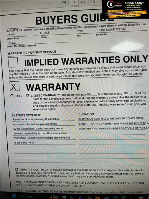 Contact Car Revolution today for information on dozens of vehicles like this 2020 Jaguar E-PACE R-Dynamic S. The E-PACE R-Dynamic S doesn't disappoint, and comes with all the quality and understated opulence buyers have come to expect from the respected Jaguar marque. A truly versatile SUV, this vehicle will please even the most discerning of buyers. Put performance, safety, beauty, sophistication and all the right amenities into a car, and here it is! Now you can own luxury without the luxury price tag! You'll love the feel of AWD in this 2020 Jaguar E-PACE. It provides a perfect balance of handling power and control in virtually every driving condition. A Jaguar with as few miles as this one is a rare find. This E-PACE R-Dynamic S was gently driven and it shows. Car Revolution has been in business since 1998 with 2 locations and over 300 cars. A family owned business, focused and determined to extend hospitality to all our clients. We make every effort to present information that is accurate. However, it is based on data provided by the vehicle manufacturer and other sources. Therefore exact Configuration, Color, Certification and Accessories should be used as a guide only and are not guaranteed under any circumstances, for any inaccuracies, claims of losses of any nature. All advertised prices includes all cost to be paid by the consumer, except: Title, Taxes, Registration, License Fees, Insurance, Dealer Prep, Additional Options and include all applicable rebates. Subject to Credit Approval. Every effort is made in order to display accurate and current vehicle information, including Pricing. All vehicles are subjected to prior sale, removal and transport elsewhere, awaiting Title and Ownership Confirmation. Inventory is updated daily and subject to change. Not responsible for typographical errors or omissions. To better insure the specific vehicle's availability, call us right away at 856-316-3444 and feel free to ask any questions. EMG-WB