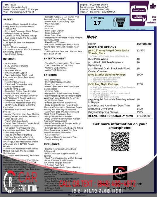 2020Mercedes-BenzC-Class The Mercedes-Benz C-Class AMG C 63's pristine good looks were combined with the Mercedes-Benz high standard of excellence in order to make this a unique find. The C-Class AMG C 63 is well maintained and has just 25,027mi. This low amount of miles makes this vehicle incomparable to the competition. Just what you've been looking for. With quality in mind, this vehicle is the perfect addition to take home. There is no reason why you shouldn't buy this Mercedes-Benz C-Class AMG C 63. It is incomparable for the price and quality. Car Revolution has been in business since 1998 with 2 locations and over 300 cars. A family owned business, focused and determined to extend hospitality to all our clients. We make every effort to present information that is accurate. However, it is based on data provided by the vehicle manufacturer and other sources. Therefore exact Configuration, Color, Certification and Accessories should be used as a guide only and are not guaranteed under any circumstances, for any inaccuracies, claims of losses of any nature. All advertised prices includes all cost to be paid by the consumer, except: Title, Taxes, Registration, License Fees, Insurance, Dealer Prep, Additional Options and include all applicable rebates. Subject to Credit Approval. Every effort is made in order to display accurate and current vehicle information, including Pricing. All vehicles are subjected to prior sale, removal and transport elsewhere, awaiting Title and Ownership Confirmation. Inventory is updated daily and subject to change. Not responsible for typographical errors or omissions. To better insure the specific vehicle's availability, call us right away at 732-527-0477 and feel free to ask any questions. EMG-WB