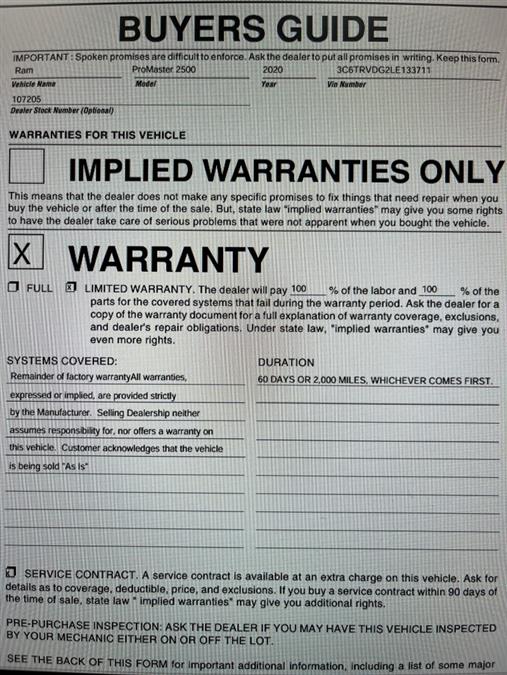 Thank you for visiting another one of Car Revolution's online listings! Please continue for more information on this 2020 Ram ProMaster 2500 High Roof with 34,606mi. This Ram includes: Optional Equipment: Convenience Power door mirrors Heated driver and passenger side door mirrors Vinyl/rubber cargo mat Power folding door mirrors Fixed rear windshield Comfort Deep tinted windows Exterior and Appearance Non-metallic paint Tires & Wheels 225/75R16C BSW All Season Tires LT225/75QR16 AS BSW front and rear tires Exterior Power Folding/heated Mirrors Power door mirrors Heated driver and passenger side door mirrors Driver and passenger convex spotter mirrors Trailer style side mirrors Power folding door mirrors Turn signal indicator in door mirrors Black door mirrors Rear Hinged Doors with Fixed Glass Split swing-out rear cargo door Deep tinted windows Fixed rear windshield Deep Tint Sunscreen Glass Deep tinted windows Additional Options Quick Order Package 21A Interior Additional Key Fobs (2) MOPAR Cargo Compartment Floor Mat Vinyl/rubber cargo mat Black Paint Bright White Clearcoat Non-metallic paint *Note - For third party subscriptions or services, please contact the dealer for more information.* It's not often you find just the vehicle you are looking for AND with low mileage. This is your chance to take home a pre-owned and barely driven Ram ProMaster 2500. You can finally stop searching... You've found the one you've been looking for. The quintessential Ram -- This Ram ProMaster 2500 High Roof speaks volumes about its owner, about uncompromising individuality, a passion for driving and standards far above the ordinary. Car Revolution has been in business since 1998 with 2 locations and over 300 cars. A family owned business, focused and determined to extend hospitality to all our clients. We make every effort to present information that is accurate. However, it is based on data provided by the vehicle manufacturer and other sources. Therefore exact Configuration, Color, Certification and Accessories should be used as a guide only and are not guaranteed under any circumstances, for any inaccuracies, claims of losses of any nature. All advertised prices includes all cost to be paid by the consumer, except: Title, Taxes, Registration, License Fees, Insurance, Dealer Prep, Additional Options and include all applicable rebates. Subject to Credit Approval. Every effort is made in order to display accurate and current vehicle information, including Pricing. All vehicles are subjected to prior sale, removal and transport elsewhere, awaiting Title and Ownership Confirmation. Inventory is updated daily and subject to change. Not responsible for typographical errors or omissions. To better insure the specific vehicle's availability, call us right away at 856-316-3444 and feel free to ask any questions. EMG-WB Car Revolution is pleased to be currently offering this 2020 Ram ProMaster Cargo Van with 34,606mi. It's not often you find just the vehicle you are looking for AND with low mileage. This is your chance to take home a pre-owned and barely driven Ram ProMaster Cargo Van. There are many vehicles on the market but if you are looking for a vehicle that will perform as good as it looks then this Ram ProMaster Cargo Van is the one! Driven by many, but adored by more, the Ram ProMaster Cargo Van is a perfect addition to any home. There is no reason why you shouldn't buy this Ram ProMaster Cargo Van . It is incomparable for the price and quality. Car Revolution has been in business since 1998 with 2 locations and over 300 cars. A family owned business, focused and determined to extend hospitality to all our clients. We make every effort to present information that is accurate. However, it is based on data provided by the vehicle manufacturer and other sources. Therefore exact Configuration, Color, Certification and Accessories should be used as a guide only and are not guaranteed under any circumstances, for any inaccuracies, claims of losses of any nature. All advertised prices includes all cost to be paid by the consumer, except: Title, Taxes, Registration, License Fees, Insurance, Dealer Prep, Additional Options and include all applicable rebates. Subject to Credit Approval. Every effort is made in order to display accurate and current vehicle information, including Pricing. All vehicles are subjected to prior sale, removal and transport elsewhere, awaiting Title and Ownership Confirmation. Inventory is updated daily and subject to change. Not responsible for typographical errors or omissions. To better insure the specific vehicle's availability, call us right away at 856-316-3444 and feel free to ask any questions. EMG-WB