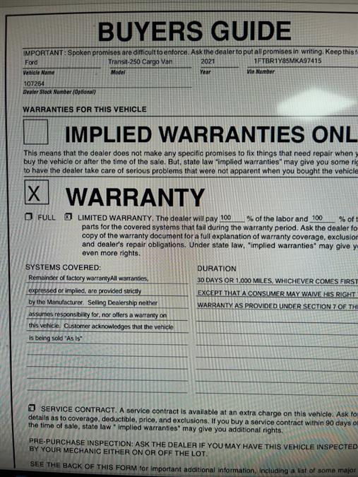 Thank you for visiting another one of Car Revolution's online listings! Please continue for more information on this 2021 Ford Transit-250 Cargo Van LOW ROOF with 89,408mi. This Ford includes: Optional Equipment: Safety and Security Auto on/off headlight control Daytime running lights Front fog lights Convenience Cargo area tie downs Cruise Control w/Adjustable Speed Limiting Device (ASLD) cruise control with steering wheel mounted controls Fixed second-row windows Rear window defroster Fixed rear windshield Day/Night rearview mirror Comfort Manual driver seat lumbar Cloth front seat upholstery Cloth front seatback upholstery Front passenger seat armrest Driver seat manual reclining, lumbar support and fore/aft control Exterior and Appearance Chrome grille Non-metallic paint Full wheel covers 16 x 6.5-inch front and rear steel wheels Seating 2WAY DRV/PASS EBONY CLOTH Bucket front seats Manual driver seat lumbar Driver seat armrest Front passenger seat armrest Driver seat manual reclining, lumbar support and fore/aft control Passenger seat manual reclining and fore/aft control Cloth Front Bucket Seats Bucket front seats Cloth front seat upholstery Cloth front seatback upholstery Tires & Wheels .SRW - STEEL W/ SILVER COVER Full wheel covers 16 x 6.5-inch front and rear steel wheels Exterior .WIPER ACTIVATED HEADLAMPS Auto on/off headlight control .FRONT FOG LAMPS Front fog lights FIXED PASSENGER DOOR GLASS Fixed second-row windows Rear window defroster Fixed rear windshield Day/Night rearview mirror FRONT LICENSE PLATE BRACKET Front license plate bracket DAYTIME RUNNING LAMPS Daytime running lights Rear-Window Defroster Rear window defroster Honeycomb Mesh Grille with Chrome Surround Chrome grille Chrome-Trimmed Halogen Headlamps Halogen headlights Additional Options EXTERIOR UPGRADE PKG - SRW Chrome grille Halogen headlights Order Code 101A SHIP-THRU NATIONAL FLEET SVCS Interior CRUISE CONTROL Cruise Control w/Adjustable Speed Limiting Device (ASLD) cruise control with steering wheel mounted controls TIE DOWN CARGO HOOKS Cargo area tie downs 2 ADDITIONAL KEYS EBONY CLOTH Rearview Mirror Day/Night rearview mirror Engine START/STOP SWITCH DELETE Paint OXFORD WHITE Non-metallic paint *Note - For third party subscriptions or services, please contact the dealer for more information.* There are many vehicles on the market but if you are looking for a vehicle that will perform as good as it looks then this Ford Transit-250 Cargo Van LOW ROOF is the one! This vehicle won't last long, take it home today. Surprising quality accompanied by a high level of performance...this Oxford White on Ebony Ford Transit-250 Cargo Van LOW ROOF could end up being the perfect match for you. Car Revolution has been in business since 1998 with 2 locations and over 300 cars. A family owned business, focused and determined to extend hospitality to all our clients. We make every effort to present information that is accurate. However, it is based on data provided by the vehicle manufacturer and other sources. Therefore exact Configuration, Color, Certification and Accessories should be used as a guide only and are not guaranteed under any circumstances, for any inaccuracies, claims of losses of any nature. All advertised prices includes all cost to be paid by the consumer, except: Title, Taxes, Registration, License Fees, Insurance, Dealer Prep, Additional Options and include all applicable rebates. Subject to Credit Approval. Every effort is made in order to display accurate and current vehicle information, including Pricing. All vehicles are subjected to prior sale, removal and transport elsewhere, awaiting Title and Ownership Confirmation. Inventory is updated daily and subject to change. Not responsible for typographical errors or omissions. To better insure the specific vehicle's availability, call us right away at 856-316-3444 and feel free to ask any questions. EMG-WB Car Revolution has a wide selection of exceptional pre-owned vehicles to choose from, including this 2021 Ford Transit Cargo Van. Look no further, you have found exactly what you've been looking for. There are many vehicles on the market but if you are looking for a vehicle that will perform as good as it looks then this Ford Transit Cargo Van is the one! Driven by many, but adored by more, the Ford Transit Cargo Van is a perfect addition to any home. You could keep looking, but why? You've found the perfect vehicle right here. Car Revolution has been in business since 1998 with 2 locations and over 300 cars. A family owned business, focused and determined to extend hospitality to all our clients. We make every effort to present information that is accurate. However, it is based on data provided by the vehicle manufacturer and other sources. Therefore exact Configuration, Color, Certification and Accessories should be used as a guide only and are not guaranteed under any circumstances, for any inaccuracies, claims of losses of any nature. All advertised prices includes all cost to be paid by the consumer, except: Title, Taxes, Registration, License Fees, Insurance, Dealer Prep, Additional Options and include all applicable rebates. Subject to Credit Approval. Every effort is made in order to display accurate and current vehicle information, including Pricing. All vehicles are subjected to prior sale, removal and transport elsewhere, awaiting Title and Ownership Confirmation. Inventory is updated daily and subject to change. Not responsible for typographical errors or omissions. To better insure the specific vehicle's availability, call us right away at 856-316-3444 and feel free to ask any questions. EMG-WB