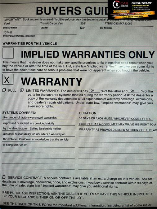 Check out this pre-owned 2021 Ford Transit Cargo Van we recently got in. This Ford includes: Optional Equipment: Convenience Cruise Control w/Adjustable Speed Limiting Device (ASLD) cruise control with steering wheel mounted controls Rear window defroster Fixed rear windshield Day/Night rearview mirror Exterior and Appearance Non-metallic paint Exterior FIXED REAR CARGO DOOR GLASS Rear window defroster Fixed rear windshield Day/Night rearview mirror FRONT LICENSE PLATE BRACKET Front license plate bracket Rear-Window Defroster Rear window defroster Additional Options Order Code 101A Interior CRUISE CONTROL Cruise Control w/Adjustable Speed Limiting Device (ASLD) cruise control with steering wheel mounted controls DARK PALAZZO GRAY VINYL Rearview Mirror Day/Night rearview mirror Engine START/STOP SWITCH DELETE Paint OXFORD WHITE Non-metallic paint *Note - For third party subscriptions or services, please contact the dealer for more information.* The Transit Cargo Van is well maintained and has just 38,754mi. This low amount of miles makes this vehicle incomparable to the competition. There are many vehicles on the market but if you are looking for a vehicle that will perform as good as it looks then this Ford Transit Cargo Van is the one! This is the one. Just what you've been looking for. Car Revolution has been in business since 1998 with 2 locations and over 300 cars. A family owned business, focused and determined to extend hospitality to all our clients. We make every effort to present information that is accurate. However, it is based on data provided by the vehicle manufacturer and other sources. Therefore exact Configuration, Color, Certification and Accessories should be used as a guide only and are not guaranteed under any circumstances, for any inaccuracies, claims of losses of any nature. All advertised prices includes all cost to be paid by the consumer, except: Title, Taxes, Registration, License Fees, Insurance, Dealer Prep, Additional Options and include all applicable rebates. Subject to Credit Approval. Every effort is made in order to display accurate and current vehicle information, including Pricing. All vehicles are subjected to prior sale, removal and transport elsewhere, awaiting Title and Ownership Confirmation. Inventory is updated daily and subject to change. Not responsible for typographical errors or omissions. To better insure the specific vehicle's availability, call us right away at 856-316-3444 and feel free to ask any questions. EMG-WB Car Revolution has a wide selection of exceptional pre-owned vehicles to choose from, including this 2021 Ford Transit Cargo Van. Low, low mileage coupled with an exacting maintenance program make this vehicle a rare find. The Ford Transit Cargo Van will provide you with everything you have always wanted in a car -- Quality, Reliability, and Character. Just what you've been looking for. With quality in mind, this vehicle is the perfect addition to take home. This is the one. Just what you've been looking for. Car Revolution has been in business since 1998 with 2 locations and over 300 cars. A family owned business, focused and determined to extend hospitality to all our clients. We make every effort to present information that is accurate. However, it is based on data provided by the vehicle manufacturer and other sources. Therefore exact Configuration, Color, Certification and Accessories should be used as a guide only and are not guaranteed under any circumstances, for any inaccuracies, claims of losses of any nature. All advertised prices includes all cost to be paid by the consumer, except: Title, Taxes, Registration, License Fees, Insurance, Dealer Prep, Additional Options and include all applicable rebates. Subject to Credit Approval. Every effort is made in order to display accurate and current vehicle information, including Pricing. All vehicles are subjected to prior sale, removal and transport elsewhere, awaiting Title and Ownership Confirmation. Inventory is updated daily and subject to change. Not responsible for typographical errors or omissions. To better insure the specific vehicle's availability, call us right away at 856-316-3444 and feel free to ask any questions. EMG-WB
