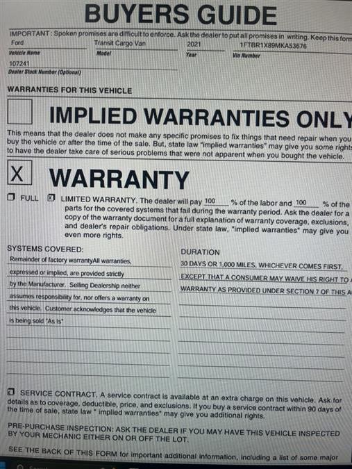 You can find this 2021 Ford Transit Cargo Van T-250 HIGH ROOF and many others like it at Car Revolution. This Ford includes: Optional Equipment: Safety and Security Daytime running lights Back-up alarm Safety BACK UP ALARM Back-up alarm Convenience Vinyl/rubber cargo area floor Plastic trunk lid trim Cargo area tie downs Cruise Control w/Adjustable Speed Limiting Device (ASLD) cruise control with steering wheel mounted controls Comfort Full vinyl floor covering Full floor coverage Tires & Wheels SRW - STEEL WHITE Wheel hub covers 16 x 6.5-inch front and rear painted steel wheels SPARE TIRE AND WHEEL DELETE Exterior FRONT LICENSE PLATE BRACKET Front license plate bracket DAYTIME RUNNING LAMPS Daytime running lights Additional Options Order Code 101A SHIP-THRU NATIONAL FLEET SVCS Interior CRUISE CONTROL Cruise Control w/Adjustable Speed Limiting Device (ASLD) cruise control with steering wheel mounted controls B-PILLAR ASSIST HANDLE D-PILLAR ASSIST HANDLES TIE DOWN CARGO HOOKS Cargo area tie downs .VINYL F/R FLOOR COVERING Full vinyl floor covering Vinyl/rubber cargo area floor Full floor coverage LOAD AREA PROTECTION PKG Plastic trunk lid trim DARK PALAZZO GRAY VINYL Engine START/STOP SWITCH DELETE SPEED LIMIT DEVICE (75 MPH) *Note - For third party subscriptions or services, please contact the dealer for more information.* Put performance, safety, beauty, sophistication and all the right amenities into a car, and here it is! Now you can own luxury without the luxury price tag! You've found the one you've been looking for. Your dream car. There is no reason why you shouldn't buy this Ford Transit Cargo Van T-250 HIGH ROOF. It is incomparable for the price and quality. Car Revolution has been in business since 1998 with 2 locations and over 300 cars. A family owned business, focused and determined to extend hospitality to all our clients. We make every effort to present information that is accurate. However, it is based on data provided by the vehicle manufacturer and other sources. Therefore exact Configuration, Color, Certification and Accessories should be used as a guide only and are not guaranteed under any circumstances, for any inaccuracies, claims of losses of any nature. All advertised prices includes all cost to be paid by the consumer, except: Title, Taxes, Registration, License Fees, Insurance, Dealer Prep, Additional Options and include all applicable rebates. Subject to Credit Approval. Every effort is made in order to display accurate and current vehicle information, including Pricing. All vehicles are subjected to prior sale, removal and transport elsewhere, awaiting Title and Ownership Confirmation. Inventory is updated daily and subject to change. Not responsible for typographical errors or omissions. To better insure the specific vehicle's availability, call us right away at 856-316-3444 and feel free to ask any questions. EMG-WB Car Revolution has a wide selection of exceptional pre-owned vehicles to choose from, including this 2021 Ford Transit Cargo Van. This Ford Transit Cargo Van 's level of quality is not meant for just anyone. It's meant for the person who strives for a classy, comfortable, and luxurious car. The quintessential Ford -- This Ford Transit Cargo Van speaks volumes about its owner, about uncompromising individuality, a passion for driving and standards far above the ordinary. You've found the one you've been looking for. Your dream car. The look is unmistakably Ford, the smooth contours and cutting-edge technology of this Ford Transit Cargo Van will definitely turn heads. Car Revolution has been in business since 1998 with 2 locations and over 300 cars. A family owned business, focused and determined to extend hospitality to all our clients. We make every effort to present information that is accurate. However, it is based on data provided by the vehicle manufacturer and other sources. Therefore exact Configuration, Color, Certification and Accessories should be used as a guide only and are not guaranteed under any circumstances, for any inaccuracies, claims of losses of any nature. All advertised prices includes all cost to be paid by the consumer, except: Title, Taxes, Registration, License Fees, Insurance, Dealer Prep, Additional Options and include all applicable rebates. Subject to Credit Approval. Every effort is made in order to display accurate and current vehicle information, including Pricing. All vehicles are subjected to prior sale, removal and transport elsewhere, awaiting Title and Ownership Confirmation. Inventory is updated daily and subject to change. Not responsible for typographical errors or omissions. To better insure the specific vehicle's availability, call us right away at 856-316-3444 and feel free to ask any questions. EMG-WB