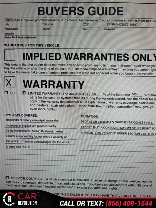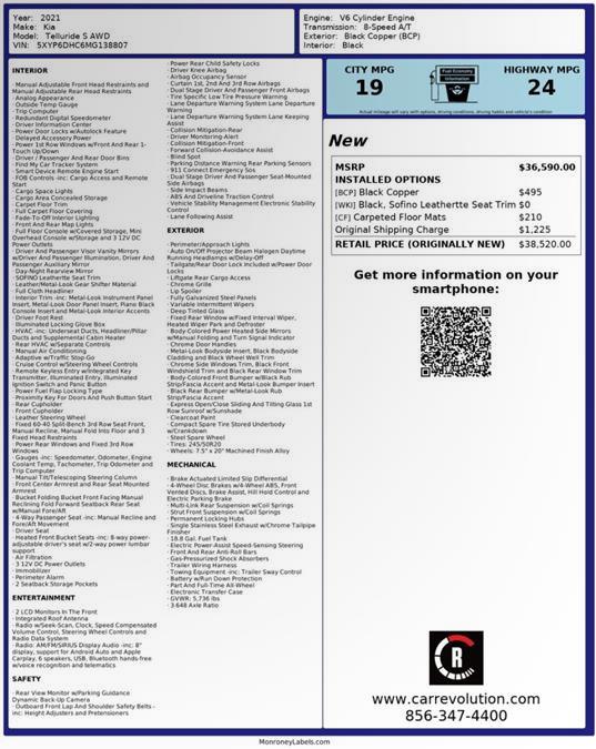 Contact Car Revolution today for information on dozens of vehicles like this 2021 Kia Telluride S AWD. This Kia includes: Optional Equipment: Interior Carpeted Floor Mats Carpet front and rear floor mats Black Comfort Carpet front and rear floor mats Exterior and Appearance Metallic paint Paint Black Copper Metallic paint *Note - For third party subscriptions or services, please contact the dealer for more information.* Do so much more with one vehicle. This Kia Telluride gives you everything you need an automobile to be. Enjoy the comfort and safety of this AWD Kia Telluride S AWD equipped with many standard features found on other vehicles as optional equipment. You've found the one you've been looking for. Your dream car. Car Revolution has been in business since 1998 with 2 locations and over 300 cars. A family owned business, focused and determined to extend hospitality to all our clients. We make every effort to present information that is accurate. However, it is based on data provided by the vehicle manufacturer and other sources. Therefore exact Configuration, Color, Certification and Accessories should be used as a guide only and are not guaranteed under any circumstances, for any inaccuracies, claims of losses of any nature. All advertised prices includes all cost to be paid by the consumer, except: Title, Taxes, Registration, License Fees, Insurance, Dealer Prep, Additional Options and include all applicable rebates. Subject to Credit Approval. Every effort is made in order to display accurate and current vehicle information, including Pricing. All vehicles are subjected to prior sale, removal and transport elsewhere, awaiting Title and Ownership Confirmation. Inventory is updated daily and subject to change. Not responsible for typographical errors or omissions. To better insure the specific vehicle's availability, call us right away at 856-316-3444 and feel free to ask any questions. EMG-WB Car Revolution has a wide selection of exceptional pre-owned vehicles to choose from, including this 2021 Kia Telluride. This Kia Telluride S is an incredibly versatile vehicle that is a must have for any family. Enjoy the grip and control of AWD performance in this nicely equipped Kia Telluride S. This is the one. Just what you've been looking for. The Kia Telluride S will provide you with everything you have always wanted in a car -- Quality, Reliability, and Character. Car Revolution has been in business since 1998 with 2 locations and over 300 cars. A family owned business, focused and determined to extend hospitality to all our clients. We make every effort to present information that is accurate. However, it is based on data provided by the vehicle manufacturer and other sources. Therefore exact Configuration, Color, Certification and Accessories should be used as a guide only and are not guaranteed under any circumstances, for any inaccuracies, claims of losses of any nature. All advertised prices includes all cost to be paid by the consumer, except: Title, Taxes, Registration, License Fees, Insurance, Dealer Prep, Additional Options and include all applicable rebates. Subject to Credit Approval. Every effort is made in order to display accurate and current vehicle information, including Pricing. All vehicles are subjected to prior sale, removal and transport elsewhere, awaiting Title and Ownership Confirmation. Inventory is updated daily and subject to change. Not responsible for typographical errors or omissions. To better insure the specific vehicle's availability, call us right away at 856-316-3444 and feel free to ask any questions. EMG-WB Contact Car Revolution today for information on dozens of vehicles like this 2021 Kia Telluride S. In their original incarnation, SUVs were chiefly owned by folks who valued utility above sport. Not anymore! The Kia Telluride S redefines the SUV and makes the perfect all around family companion. Few vehicles can match the safety and comfort of this AWD Kia Telluride S. With enhanced performance, refined interior and exceptional fuel efficiency, this AWD Kia is in a class of its own. The quintessential Kia -- This Kia Telluride S speaks volumes about its owner, about uncompromising individuality, a passion for driving and standards far above the ordinary. You can finally stop searching... You've found the one you've been looking for. Car Revolution has been in business since 1998 with 2 locations and over 300 cars. A family owned business, focused and determined to extend hospitality to all our clients. We make every effort to present information that is accurate. However, it is based on data provided by the vehicle manufacturer and other sources. Therefore exact Configuration, Color, Certification and Accessories should be used as a guide only and are not guaranteed under any circumstances, for any inaccuracies, claims of losses of any nature. All advertised prices includes all cost to be paid by the consumer, except: Title, Taxes, Registration, License Fees, Insurance, Dealer Prep, Additional Options and include all applicable rebates. Subject to Credit Approval. Every effort is made in order to display accurate and current vehicle information, including Pricing. All vehicles are subjected to prior sale, removal and transport elsewhere, awaiting Title and Ownership Confirmation. Inventory is updated daily and subject to change. Not responsible for typographical errors or omissions. To better insure the specific vehicle's availability, call us right away at 856-316-3444 and feel free to ask any questions. EMG-WB