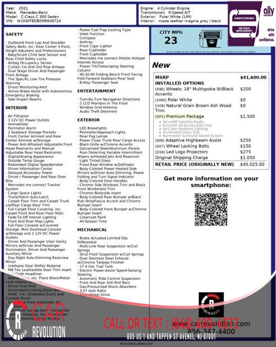 You can find this 2021 Mercedes-Benz C-Class C 300 and many others like it at CAR REVOLUTION. There's a level of quality and refinement in this Mercedes-Benz C-Class C 300 that you won't find in your average vehicle. Start enjoying more time in your new ride and less time at the gas station with this 2021 Mercedes-Benz C-Class. Low, low mileage coupled with an exacting maintenance program make this vehicle a rare find. This is the one. Just what you've been looking for. Car Revolution has been in business since 1998 with 2 locations and over 300 cars. A family owned business, focused and determined to extend hospitality to all our clients. We make every effort to present information that is accurate. However, it is based on data provided by the vehicle manufacturer and other sources. Therefore exact Configuration, Color, Certification and Accessories should be used as a guide only and are not guaranteed under any circumstances, for any inaccuracies, claims of losses of any nature. All advertised prices includes all cost to be paid by the consumer, except: Title, Taxes, Registration, License Fees, Insurance, Dealer Prep, Additional Options and include all applicable rebates. Subject to Credit Approval. Every effort is made in order to display accurate and current vehicle information, including Pricing. All vehicles are subjected to prior sale, removal and transport elsewhere, awaiting Title and Ownership Confirmation. Inventory is updated daily and subject to change. Not responsible for typographical errors or omissions. To better insure the specific vehicle's availability, call us right away at 732-527-0477 and feel free to ask any questions. EMG-WB