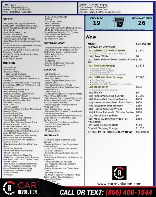 Car Revolution is honored to present a wonderful example of pure vehicle design... this 2021 Mercedes-Benz GLE GLE 350 only has 97,844mi on it and could potentially be the vehicle of your dreams! This SUV is a superb example of what a tough, work focused vehicle should be. Exceptional towing, acceleration and torque will help you get the job done. The Mercedes-Benz GLE GLE 350's pristine good looks were combined with the Mercedes-Benz high standard of excellence in order to make this a unique find. Just what you've been looking for. With quality in mind, this vehicle is the perfect addition to take home. The quintessential Mercedes-Benz -- This Mercedes-Benz GLE GLE 350 speaks volumes about its owner, about uncompromising individuality, a passion for driving and standards far above the ordinary. Car Revolution has been in business since 1998 with 2 locations and over 300 cars. A family owned business, focused and determined to extend hospitality to all our clients. We make every effort to present information that is accurate. However, it is based on data provided by the vehicle manufacturer and other sources. Therefore exact Configuration, Color, Certification and Accessories should be used as a guide only and are not guaranteed under any circumstances, for any inaccuracies, claims of losses of any nature. All advertised prices includes all cost to be paid by the consumer, except: Title, Taxes, Registration, License Fees, Insurance, Dealer Prep, Additional Options and include all applicable rebates. Subject to Credit Approval. Every effort is made in order to display accurate and current vehicle information, including Pricing. All vehicles are subjected to prior sale, removal and transport elsewhere, awaiting Title and Ownership Confirmation. Inventory is updated daily and subject to change. Not responsible for typographical errors or omissions. To better insure the specific vehicle's availability, call us right away at 856-316-3444 and feel free to ask any questions. EMG-WB