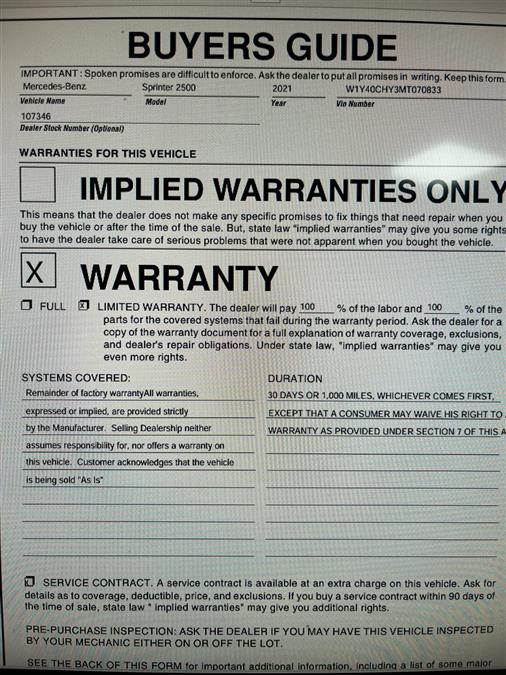 Car Revolution is honored to present a wonderful example of pure vehicle design... this 2021 Mercedes-Benz Sprinter 2500 High Roof I4 170 GAS only has 26,442mi on it and could potentially be the vehicle of your dreams! This Mercedes-Benz includes: Optional Equipment: Safety and Security Active Lane Keeping Assist Blind Spot Assist Safety Seat belts orange, driver and front passenger Convenience Wood cargo area floor Power folding door mirrors Mechanical Electric parking brake Electronic parking brake Powertrain and Mechanical 75.00 mph speed limiter Electronic parking brake Exterior Electrically folding exterior mirrors Power folding door mirrors Rear doors, opening to side wall Split swing-out rear cargo door Interior Parametric special module (PSM) Blind Spot Assist Blind Spot Assist Active Lane Keeping Assist Active Lane Keeping Assist Wood floor with 6 D-rings Wood cargo area floor Cargo area tie downs Engine 70ED4 Top speed limitation 75 mph 75.00 mph speed limiter *Note - For third party subscriptions or services, please contact the dealer for more information.* You deserve a vehicle designed for higher expectations. This Mercedes-Benz Sprinter 2500 High Roof I4 170 GAS delivers with a luxurious, well-appointed interior and world-class engineering. Exceptional in every sense of the word, this incredibly low mileage vehicle is one of a kind. Based on the superb condition of this vehicle, along with the options and color, this Mercedes-Benz Sprinter 2500 High Roof I4 170 GAS is sure to sell fast. Car Revolution has been in business since 1998 with 2 locations and over 300 cars. A family owned business, focused and determined to extend hospitality to all our clients. We make every effort to present information that is accurate. However, it is based on data provided by the vehicle manufacturer and other sources. Therefore exact Configuration, Color, Certification and Accessories should be used as a guide only and are not guaranteed under any circumstances, for any inaccuracies, claims of losses of any nature. All advertised prices includes all cost to be paid by the consumer, except: Title, Taxes, Registration, License Fees, Insurance, Dealer Prep, Additional Options and include all applicable rebates. Subject to Credit Approval. Every effort is made in order to display accurate and current vehicle information, including Pricing. All vehicles are subjected to prior sale, removal and transport elsewhere, awaiting Title and Ownership Confirmation. Inventory is updated daily and subject to change. Not responsible for typographical errors or omissions. To better insure the specific vehicle's availability, call us right away at 856-316-3444 and feel free to ask any questions. EMG-WB Check out this pre-owned 2021 Mercedes-Benz Sprinter Cargo Van we recently got in. You appreciate the finer things in life, the vehicle you drive should not be the exception. Style, performance, sophistication is in a class of its own with this stunning Mercedes-Benz Sprinter Cargo Van . A Mercedes-Benz with as few miles as this one is a rare find. This Sprinter Cargo Van was gently driven and it shows. You could keep looking, but why? You've found the perfect vehicle right here. There are many vehicles on the market but if you are looking for a vehicle that will perform as good as it looks then this Mercedes-Benz Sprinter Cargo Van is the one! Car Revolution has been in business since 1998 with 2 locations and over 300 cars. A family owned business, focused and determined to extend hospitality to all our clients. We make every effort to present information that is accurate. However, it is based on data provided by the vehicle manufacturer and other sources. Therefore exact Configuration, Color, Certification and Accessories should be used as a guide only and are not guaranteed under any circumstances, for any inaccuracies, claims of losses of any nature. All advertised prices includes all cost to be paid by the consumer, except: Title, Taxes, Registration, License Fees, Insurance, Dealer Prep, Additional Options and include all applicable rebates. Subject to Credit Approval. Every effort is made in order to display accurate and current vehicle information, including Pricing. All vehicles are subjected to prior sale, removal and transport elsewhere, awaiting Title and Ownership Confirmation. Inventory is updated daily and subject to change. Not responsible for typographical errors or omissions. To better insure the specific vehicle's availability, call us right away at 856-316-3444 and feel free to ask any questions. EMG-WB