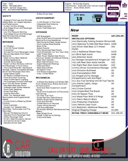 CAR REVOLUTION has a wide selection of exceptional pre-owned vehicles to choose from, including this 2021 Mercedes-Benz Sprinter Cargo Van. With amenities and luxuries befitting a modern day king, this splendorous coach reigns supreme. The Mercedes-Benz Sprinter Cargo Van will provide you with everything you have always wanted in a car -- Quality, Reliability, and Character. The look is unmistakably Mercedes-Benz, the smooth contours and cutting-edge technology of this Mercedes-Benz Sprinter Cargo Van will definitely turn heads. The quintessential Mercedes-Benz -- This Mercedes-Benz Sprinter Cargo Van speaks volumes about its owner, about uncompromising individuality, a passion for driving and standards far above the ordinary. Car Revolution has been in business since 1998 with 2 locations and over 300 cars. A family owned business, focused and determined to extend hospitality to all our clients. We make every effort to present information that is accurate. However, it is based on data provided by the vehicle manufacturer and other sources. Therefore exact Configuration, Color, Certification and Accessories should be used as a guide only and are not guaranteed under any circumstances, for any inaccuracies, claims of losses of any nature.VEHICLE SOLD MECHANICALLY AND COSMETICALLY AS IS CASH ONLY NO FINANCING AVAILABLE ON THIS UNIT. All advertised prices includes all cost to be paid by the consumer, except: Title, Taxes, Registration, License Fees, Insurance, Dealer Prep, Additional Options and include all applicable rebates. Subject to Credit Approval. Every effort is made in order to display accurate and current vehicle information, including Pricing. All vehicles are subjected to prior sale, removal and transport elsewhere, awaiting Title and Ownership Confirmation. Inventory is updated daily and subject to change. Not responsible for typographical errors or omissions. To better insure the specific vehicle's availability, call us right away at 732-527-0477 and feel free to ask any questions. EMG-WB