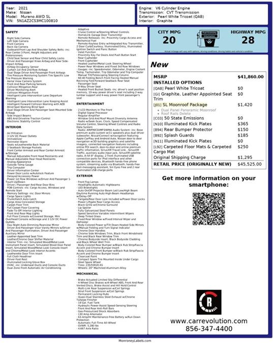 2021NissanMurano This Nissan Murano SL defines excellence in an SUV. It has the convenience of limitless boundaries paired with city sophistication. The Nissan Murano SL's pristine good looks were combined with the Nissan high standard of excellence in order to make this a unique find. Take home this 2021 Nissan Murano SL and enjoy the safety and added performance of AWD. This vehicle won't last long, take it home today. Car Revolution has been in business since 1998 with 2 locations and over 300 cars. A family owned business, focused and determined to extend hospitality to all our clients. We make every effort to present information that is accurate. However, it is based on data provided by the vehicle manufacturer and other sources. Therefore exact Configuration, Color, Certification and Accessories should be used as a guide only and are not guaranteed under any circumstances, for any inaccuracies, claims of losses of any nature. All advertised prices includes all cost to be paid by the consumer, except: Title, Taxes, Registration, License Fees, Insurance, Dealer Prep, Additional Options and include all applicable rebates. Subject to Credit Approval. Every effort is made in order to display accurate and current vehicle information, including Pricing. All vehicles are subjected to prior sale, removal and transport elsewhere, awaiting Title and Ownership Confirmation. Inventory is updated daily and subject to change. Not responsible for typographical errors or omissions. To better insure the specific vehicle's availability, call us right away at 856-316-3444 and feel free to ask any questions. EMG-WB
