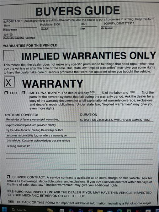 Standard Equipments on 2021 Ram Promaster 3500 High Roof EXT in Maple Shade, NJ