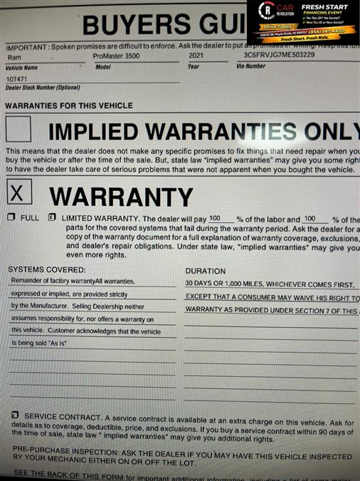 Contact Car Revolution today for information on dozens of vehicles like this 2021 Ram ProMaster 3500 High Roof EXT. This Ram includes: Optional Equipment: Safety and Security Daytime running lights Safety Orange Seat Belts Convenience Power door mirrors Heated driver and passenger side door mirrors Power folding door mirrors Exterior and Appearance Front license plate bracket Powertrain and Mechanical Auto stop-start engine 70.00 mph speed limiter Exterior Daytime Running Headlamps Daytime running lights Front License Plate Bracket Front license plate bracket Power Folding/heated Mirrors Power door mirrors Heated driver and passenger side door mirrors Driver and passenger convex spotter mirrors Trailer style side mirrors Power folding door mirrors Turn signal indicator in door mirrors Black door mirrors Upfit Interface Connector Additional Options Quick Order Package 21A Interior Additional Key Fobs (2) Manufacturer's Statement of Origin Delete Inside Rear View Mirror Door-Only Key Door Auto Lock-Unlock Auto-locking doors Key-In-ignition Alert Key in vehicle warning Driver Feedback System Radio Mute on Reverse Black Engine 70 Mph Maximum Speed 70.00 mph speed limiter Engine Auto Shut-Off Auto stop-start engine *Note - For third party subscriptions or services, please contact the dealer for more information.* Is it possible to fall in love with a vehicle? It is when your vehicle is as prestige as the Ram ProMaster 3500. The look is unmistakably Ram, the smooth contours and cutting-edge technology of this Ram ProMaster 3500 High Roof EXT will definitely turn heads. The 2021 Ram exterior is finished in a breathtaking Patriot Blue Pearlcoat, while being complemented by such a gorgeous Black interior. This color combination is stunning and absolutely beautiful! Car Revolution has been in business since 1998 with 2 locations and over 300 cars. A family owned business, focused and determined to extend hospitality to all our clients. We make every effort to present information that is accurate. However, it is based on data provided by the vehicle manufacturer and other sources. Therefore exact Configuration, Color, Certification and Accessories should be used as a guide only and are not guaranteed under any circumstances, for any inaccuracies, claims of losses of any nature. All advertised prices includes all cost to be paid by the consumer, except: Title, Taxes, Registration, License Fees, Insurance, Dealer Prep, Additional Options and include all applicable rebates. Subject to Credit Approval. Every effort is made in order to display accurate and current vehicle information, including Pricing. All vehicles are subjected to prior sale, removal and transport elsewhere, awaiting Title and Ownership Confirmation. Inventory is updated daily and subject to change. Not responsible for typographical errors or omissions. To better insure the specific vehicle's availability, call us right away at 856-316-3444 and feel free to ask any questions. EMG-WB This 2021 Ram ProMaster Cargo Van is offered to you for sale by Car Revolution. Is it possible to fall in love with a vehicle? It is when your vehicle is as prestige as the Ram ProMaster Cargo Van. This is about the time when you're saying it is too good to be true, and let us be the one's to tell you, it is absolutely true. The look is unmistakably Ram, the smooth contours and cutting-edge technology of this Ram ProMaster Cargo Van will definitely turn heads. Just what you've been looking for. With quality in mind, this vehicle is the perfect addition to take home. Car Revolution has been in business since 1998 with 2 locations and over 300 cars. A family owned business, focused and determined to extend hospitality to all our clients. We make every effort to present information that is accurate. However, it is based on data provided by the vehicle manufacturer and other sources. Therefore exact Configuration, Color, Certification and Accessories should be used as a guide only and are not guaranteed under any circumstances, for any inaccuracies, claims of losses of any nature. All advertised prices includes all cost to be paid by the consumer, except: Title, Taxes, Registration, License Fees, Insurance, Dealer Prep, Additional Options and include all applicable rebates. Subject to Credit Approval. Every effort is made in order to display accurate and current vehicle information, including Pricing. All vehicles are subjected to prior sale, removal and transport elsewhere, awaiting Title and Ownership Confirmation. Inventory is updated daily and subject to change. Not responsible for typographical errors or omissions. To better insure the specific vehicle's availability, call us right away at 856-316-3444 and feel free to ask any questions. EMG-WB