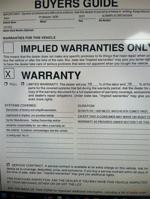 Used 2021 Ram Promaster 3500 |72,222 Miles|Front Wheel Drive