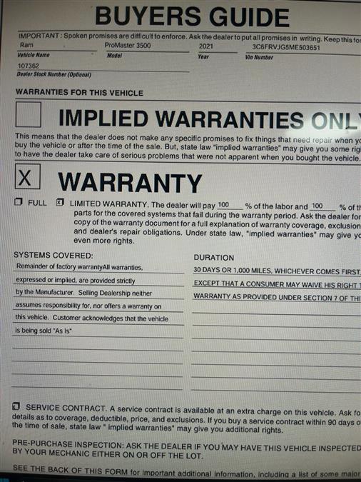 Looking for a clean, well-cared for 2021 Ram ProMaster 3500? This is it. This Ram includes: Optional Equipment: Safety and Security Daytime running lights Safety Orange Seat Belts Convenience Power door mirrors Heated driver and passenger side door mirrors Power folding door mirrors Exterior and Appearance Front license plate bracket Powertrain and Mechanical Auto stop-start engine 70.00 mph speed limiter Exterior Daytime Running Headlamps Daytime running lights Front License Plate Bracket Front license plate bracket Power Folding/heated Mirrors Power door mirrors Heated driver and passenger side door mirrors Driver and passenger convex spotter mirrors Trailer style side mirrors Power folding door mirrors Turn signal indicator in door mirrors Black door mirrors Upfit Interface Connector Additional Options Quick Order Package 21A Interior Additional Key Fobs (2) Manufacturer's Statement of Origin Delete Inside Rear View Mirror Door-Only Key Door Auto Lock-Unlock Auto-locking doors Key-In-ignition Alert Key in vehicle warning Driver Feedback System Radio Mute on Reverse Black Engine 70 Mph Maximum Speed 70.00 mph speed limiter Engine Auto Shut-Off Auto stop-start engine *Note - For third party subscriptions or services, please contact the dealer for more information.* There's a level of quality and refinement in this Ram ProMaster 3500 High Roof EXT that you won't find in your average vehicle. Just what you've been looking for. With quality in mind, this vehicle is the perfect addition to take home. Beautiful color combination with Patriot Blue Pearlcoat exterior over Black interior making this the one to own! Car Revolution has been in business since 1998 with 2 locations and over 300 cars. A family owned business, focused and determined to extend hospitality to all our clients. We make every effort to present information that is accurate. However, it is based on data provided by the vehicle manufacturer and other sources. Therefore exact Configuration, Color, Certification and Accessories should be used as a guide only and are not guaranteed under any circumstances, for any inaccuracies, claims of losses of any nature. All advertised prices includes all cost to be paid by the consumer, except: Title, Taxes, Registration, License Fees, Insurance, Dealer Prep, Additional Options and include all applicable rebates. Subject to Credit Approval. Every effort is made in order to display accurate and current vehicle information, including Pricing. All vehicles are subjected to prior sale, removal and transport elsewhere, awaiting Title and Ownership Confirmation. Inventory is updated daily and subject to change. Not responsible for typographical errors or omissions. To better insure the specific vehicle's availability, call us right away at 856-316-3444 and feel free to ask any questions. EMG-WB Looking for a clean, well-cared for 2021 Ram ProMaster Cargo Van? This is it. You appreciate the finer things in life, the vehicle you drive should not be the exception. Style, performance, sophistication is in a class of its own with this stunning Ram ProMaster Cargo Van . There are many vehicles on the market but if you are looking for a vehicle that will perform as good as it looks then this Ram ProMaster Cargo Van is the one! Driven by many, but adored by more, the Ram ProMaster Cargo Van is a perfect addition to any home. There is no reason why you shouldn't buy this Ram ProMaster Cargo Van . It is incomparable for the price and quality. Car Revolution has been in business since 1998 with 2 locations and over 300 cars. A family owned business, focused and determined to extend hospitality to all our clients. We make every effort to present information that is accurate. However, it is based on data provided by the vehicle manufacturer and other sources. Therefore exact Configuration, Color, Certification and Accessories should be used as a guide only and are not guaranteed under any circumstances, for any inaccuracies, claims of losses of any nature. All advertised prices includes all cost to be paid by the consumer, except: Title, Taxes, Registration, License Fees, Insurance, Dealer Prep, Additional Options and include all applicable rebates. Subject to Credit Approval. Every effort is made in order to display accurate and current vehicle information, including Pricing. All vehicles are subjected to prior sale, removal and transport elsewhere, awaiting Title and Ownership Confirmation. Inventory is updated daily and subject to change. Not responsible for typographical errors or omissions. To better insure the specific vehicle's availability, call us right away at 856-316-3444 and feel free to ask any questions. EMG-WB