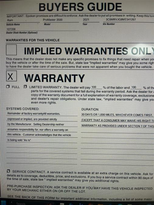 Pictures of used 2021 Ram Promaster 3500 High Roof EXT in Maple Shade, NJ
