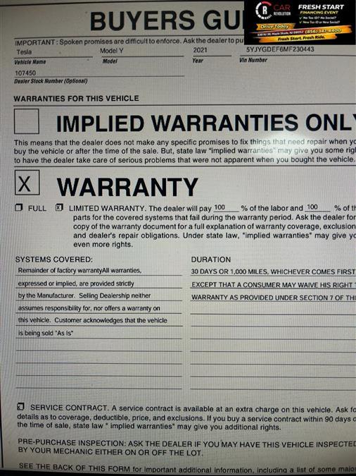 Car Revolution is honored to present a wonderful example of pure vehicle design... this 2021 Tesla Model Y Performance only has 48,815mi on it and could potentially be the vehicle of your dreams! This Tesla Model Y offers all the comforts of a well-optioned sedan with the utility you demand from an SUV. Excellence, luxury and stature are just a few of the pillars this car is built upon. When driving an all wheel drive vehicle, such as this Tesla Model Y Performance, superior acceleration, traction, and control come standard. In addition to being well-cared for, this Tesla Model Y has very low mileage making it a rare find. Car Revolution has been in business since 1998 with 2 locations and over 300 cars. A family owned business, focused and determined to extend hospitality to all our clients. We make every effort to present information that is accurate. However, it is based on data provided by the vehicle manufacturer and other sources. Therefore exact Configuration, Color, Certification and Accessories should be used as a guide only and are not guaranteed under any circumstances, for any inaccuracies, claims of losses of any nature. All advertised prices includes all cost to be paid by the consumer, except: Title, Taxes, Registration, License Fees, Insurance, Dealer Prep, Additional Options and include all applicable rebates. Subject to Credit Approval. Every effort is made in order to display accurate and current vehicle information, including Pricing. All vehicles are subjected to prior sale, removal and transport elsewhere, awaiting Title and Ownership Confirmation. Inventory is updated daily and subject to change. Not responsible for typographical errors or omissions. To better insure the specific vehicle's availability, call us right away at 856-316-3444 and feel free to ask any questions. EMG-WB