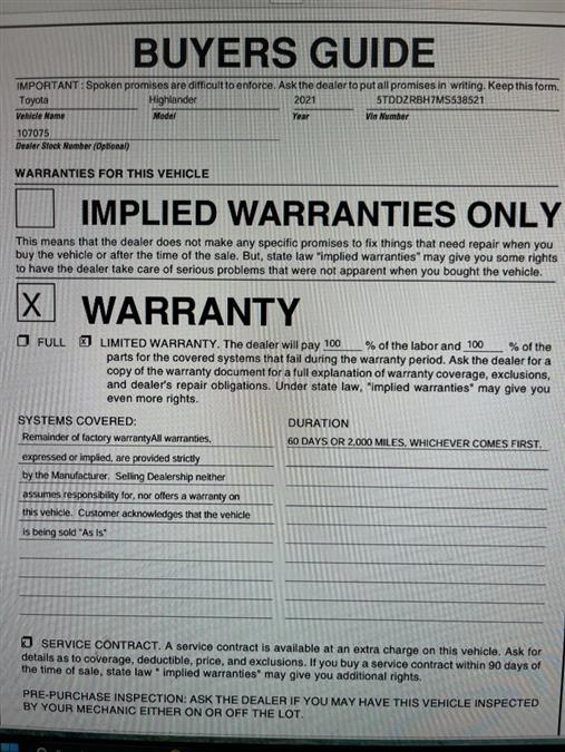 Car Revolution is excited to offer this 2021 Toyota Highlander Limited AWD. This Toyota includes: Optional Equipment: Safety and Security Rear seat center 3-point seatbelt Panoramic View Monitor front mounted camera Panoramic View Monitor right side camera Panoramic View Monitor left side camera Panoramic View Monitor rear camera with washer Aerial view camera Interior All-Wthr Floor/Cargo Liner Rubber front and rear floor mats Vinyl/rubber cargo mat Graphite Panoramic View Monitor Panoramic View Monitor front mounted camera Panoramic View Monitor right side camera Panoramic View Monitor left side camera Panoramic View Monitor rear camera with washer Aerial view camera Convenience Vinyl/rubber cargo mat Entertainment Premium Audio with JBL Clari-Fi and 12.3 Screen External memory control IHeartRadio/Pandora/Slacker internet radio capability 3 month satellite trial subscription JBL speakers 1200W amplifier Clari-Fi digital signal processor Siri Eyes Free/Amazon Alexa compatible voice activated audio controls Bluetooth wireless audio streaming 12.3 inch primary display Primary monitor touchscreen Dynamic Navigation (3-year trial) integrated navigation system with voice activation Destination Assist with 1-year trial turn-by-turn navigation system Safety Connect with 1-year trial vehicle integrated emergency SOS system Bluetooth handsfree wireless device connectivity Wi-Fi Connect with up to 2GB within 3-month trial mobile hotspot internet access Apple CarPlay/Android Auto smart device mirroring 5 USB ports Service Connect with 10-year trial service interval indicator Safety Connect with 1-year trial vehicle tracker Over the air updates AM/FM/digital/SiriusXMsatellite Smart device remote start Comfort Seating capacity - 8 60-40 folding second-row seats Split-bench second-row seat 3 rear seat head restraints Rubber front and rear floor mats Second-row center armrest Exterior and Appearance Metallic paint Wheel security locks Paint Blueprint Metallic paint Seating Seating for 8; 2nd Row 60/40 Bench Seat Instead of Captain's Seats Seating capacity - 8 60-40 folding second-row seats Manual reclining second-row seats Split-bench second-row seat Fold forward second-row seatback Second-row seats with manual fore and aft 3 rear seat head restraints 60-40 folding third-row passenger seat Third-row manual reclining seats Manual fold into floor third-row seat Height adjustable third-row head restraints Manual third-row head restraint control Rear seat center 3-point seatbelt 3 third-row head restraints Third-row split-bench seat Second-row center armrest Emissions 50 State Emissions LEV3-ULEV70 emissions Tier 3 Bin 70 emissions Tires & Wheels Wheel Locks Wheel security locks Additional Options 12.3-in Touchscreen, Bird's Eye View Camera with Perimeter Scan, Curb View Panoramic View Monitor front mounted camera Panoramic View Monitor right side camera Panoramic View Monitor left side camera Panoramic View Monitor rear camera with washer Aerial view camera In-car Entertainment 12.3 inch primary display *Note - For third party subscriptions or services, please contact the dealer for more information.* Off-road or on the street, this Toyota Highlander Limited AWD handles with ease. Is it possible to fall in love with a vehicle? It is when your vehicle is as prestige as the Toyota Highlander. Few vehicles can match the safety and comfort of this AWD Toyota Highlander Limited AWD. With enhanced performance, refined interior and exceptional fuel efficiency, this AWD Toyota is in a class of its own. Added comfort with contemporary style is the leather interior to heighten the quality and craftsmanship for the Toyota Highlander Limited AWD. Car Revolution has been in business since 1998 with 2 locations and over 300 cars. A family owned business, focused and determined to extend hospitality to all our clients. We make every effort to present information that is accurate. However, it is based on data provided by the vehicle manufacturer and other sources. Therefore exact Configuration, Color, Certification and Accessories should be used as a guide only and are not guaranteed under any circumstances, for any inaccuracies, claims of losses of any nature. All advertised prices includes all cost to be paid by the consumer, except: Title, Taxes, Registration, License Fees, Insurance, Dealer Prep, Additional Options and include all applicable rebates. Subject to Credit Approval. Every effort is made in order to display accurate and current vehicle information, including Pricing. All vehicles are subjected to prior sale, removal and transport elsewhere, awaiting Title and Ownership Confirmation. Inventory is updated daily and subject to change. Not responsible for typographical errors or omissions. To better insure the specific vehicle's availability, call us right away at 856-316-3444 and feel free to ask any questions. EMG-WB This 2021 Toyota Highlander Limited is offered to you for sale by Car Revolution. This Toyota Highlander Limited defines excellence in an SUV. It has the convenience of limitless boundaries paired with city sophistication. You appreciate the finer things in life, the vehicle you drive should not be the exception. Style, performance, sophistication is in a class of its own with this stunning Toyota Highlander Limited. Take home this 2021 Toyota Highlander Limited and enjoy the safety and added performance of AWD. You could keep looking, but why? You've found the perfect vehicle right here. Car Revolution has been in business since 1998 with 2 locations and over 300 cars. A family owned business, focused and determined to extend hospitality to all our clients. We make every effort to present information that is accurate. However, it is based on data provided by the vehicle manufacturer and other sources. Therefore exact Configuration, Color, Certification and Accessories should be used as a guide only and are not guaranteed under any circumstances, for any inaccuracies, claims of losses of any na