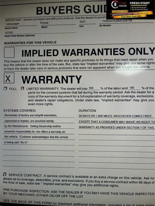 Car Revolution has a wide selection of exceptional pre-owned vehicles to choose from, including this 2021 Volkswagen Passat. The greater your fuel-efficiency, the less your carbon footprint. And with exceptional MPGs, this Volkswagen Passat treads ever so lightly on Mother Earth. It's not a misprint. And the odometer isn't broken. This is a very low mileage Volkswagen Passat. A rare find these days. This White Volkswagen is clean and shiny exterior makes it look like it came straight from the factory. You could keep looking, but why? You've found the perfect vehicle right here. Car Revolution has been in business since 1998 with 2 locations and over 300 cars. A family owned business, focused and determined to extend hospitality to all our clients. We make every effort to present information that is accurate. However, it is based on data provided by the vehicle manufacturer and other sources. Therefore exact Configuration, Color, Certification and Accessories should be used as a guide only and are not guaranteed under any circumstances, for any inaccuracies, claims of losses of any nature. All advertised prices includes all cost to be paid by the consumer, except: Title, Taxes, Registration, License Fees, Insurance, Dealer Prep, Additional Options and include all applicable rebates. Subject to Credit Approval. Every effort is made in order to display accurate and current vehicle information, including Pricing. All vehicles are subjected to prior sale, removal and transport elsewhere, awaiting Title and Ownership Confirmation. Inventory is updated daily and subject to change. Not responsible for typographical errors or omissions. To better insure the specific vehicle's availability, call us right away at 856-316-3444 and feel free to ask any questions. EMG-WB