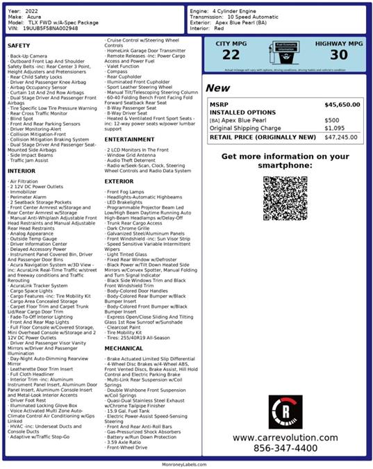 Car Revolution has a wide selection of exceptional pre-owned vehicles to choose from, including this 2022 Acura TLX. Sophistication & understated luxury comes standard on this Acura TLX w/A-Spec Package. Well-known by many, the TLX has become a household name in the realm of quality and prestige. With less than 21,589mi on this Acura TLX, you'll appreciate the practically showroom newness of this vehicle. Look no further, you have found exactly what you've been looking for. This is the one. Just what you've been looking for. Car Revolution has been in business since 1998 with 2 locations and over 300 cars. A family owned business, focused and determined to extend hospitality to all our clients. We make every effort to present information that is accurate. However, it is based on data provided by the vehicle manufacturer and other sources. Therefore exact Configuration, Color, Certification and Accessories should be used as a guide only and are not guaranteed under any circumstances, for any inaccuracies, claims of losses of any nature. All advertised prices includes all cost to be paid by the consumer, except: Title, Taxes, Registration, License Fees, Insurance, Dealer Prep, Additional Options and include all applicable rebates. Subject to Credit Approval. Every effort is made in order to display accurate and current vehicle information, including Pricing. All vehicles are subjected to prior sale, removal and transport elsewhere, awaiting Title and Ownership Confirmation. Inventory is updated daily and subject to change. Not responsible for typographical errors or omissions. To better insure the specific vehicle's availability, call us right away at 856-316-3444 and feel free to ask any questions. EMG-WB
