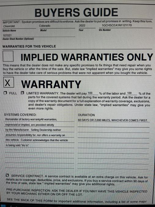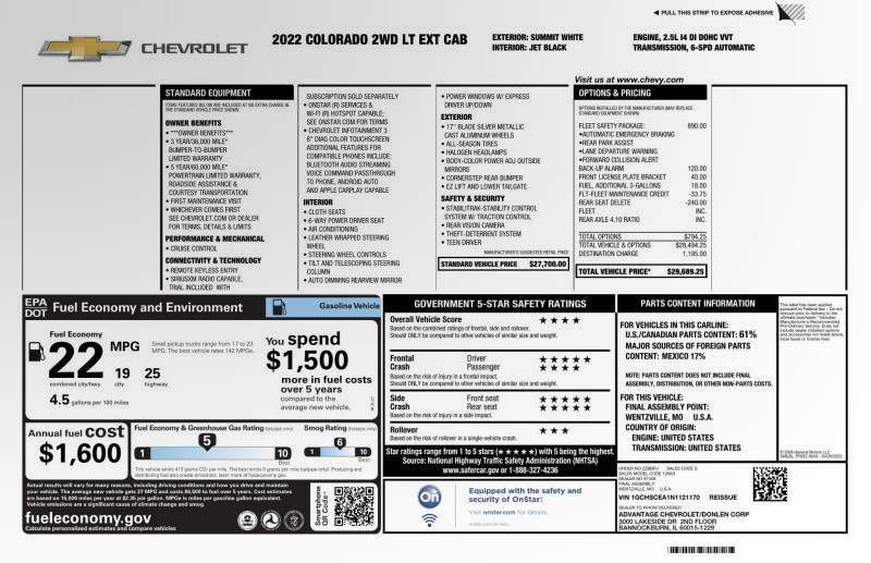 Check out this pre-owned 2022 Chevrolet Colorado we recently got in. This Chevrolet includes: Optional Equipment: Safety and Security Predictive brake assist system Back-up alarm Lane Departure Warning UltraSonic rear parking sensors Comfort Seating capacity - 2 Full vinyl floor covering Exterior and Appearance Non-metallic paint Front license plate bracket Mechanical Automatic Emergency Braking Predictive brake assist system Automatic Emergency Braking forward collision mitigation Seating Rear Seat Delete Seating capacity - 2 Exterior Front License Plate Kit Front license plate bracket SEO: 3-Gallons Additional Fuel Additional Options Fleet Safety Package Predictive brake assist system Automatic Emergency Braking forward collision mitigation Forward Collision Alert Safety Package Lane Departure Warning Forward Collision Alert UltraSonic rear parking sensors Preferred Equipment Group 2LT Interior Full-Length Black Vinyl Floor Covering Full vinyl floor covering Ultrasonic Rear Park Assist UltraSonic rear parking sensors Buckle to Drive SEO: 97 Decibel Backup Alarm Back-up alarm Forward Collision Alert Forward Collision Alert Lane Departure Warning Lane Departure Warning Jet Black Fuel Economy and Emissions California emissions Emissions extras exemption Paint Summit White Non-metallic paint Emissions Federal Emissions Override Emissions extras exemption California State Emissions Requirements California emissions *Note - For third party subscriptions or services, please contact the dealer for more information.* The Colorado 2WD LT has been lightly driven and there is little to no wear and tear on this vehicle. The care taken on this pre-owned vehicle is reflective of the 44,091mi put on this Chevrolet. You could keep looking, but why? You've found the perfect vehicle right here. Driven by many, but adored by more, the Chevrolet Colorado 2WD LT is a perfect addition to any home. Car Revolution has been in business since 1998 with 2 locations and over 300 cars. A family owned business, focused and determined to extend hospitality to all our clients. We make every effort to present information that is accurate. However, it is based on data provided by the vehicle manufacturer and other sources. Therefore exact Configuration, Color, Certification and Accessories should be used as a guide only and are not guaranteed under any circumstances, for any inaccuracies, claims of losses of any nature. All advertised prices includes all cost to be paid by the consumer, except: Title, Taxes, Registration, License Fees, Insurance, Dealer Prep, Additional Options and include all applicable rebates. Subject to Credit Approval. Every effort is made in order to display accurate and current vehicle information, including Pricing. All vehicles are subjected to prior sale, removal and transport elsewhere, awaiting Title and Ownership Confirmation. Inventory is updated daily and subject to change. Not responsible for typographical errors or omissions. To better insure the specific vehicle's availability, call us right away at 856-316-3444 and feel free to ask any questions. EMG-WB Contact Car Revolution today for information on dozens of vehicles like this 2022 Chevrolet Colorado 2WD LT. The Colorado 2WD LT is well maintained and has just 44,091mi. This low amount of miles makes this vehicle incomparable to the competition. The Chevrolet Colorado 2WD LT will provide you with everything you have always wanted in a car -- Quality, Reliability, and Character. Driven by many, but adored by more, the Chevrolet Colorado 2WD LT is a perfect addition to any home. This is about the time when you're saying it is too good to be true, and let us be the one's to tell you, it is absolutely true. Car Revolution has been in business since 1998 with 2 locations and over 300 cars. A family owned business, focused and determined to extend hospitality to all our clients. We make every effort to present information that is accurate. However, it is based on data provided by the vehicle manufacturer and other sources. Therefore exact Configuration, Color, Certification and Accessories should be used as a guide only and are not guaranteed under any circumstances, for any inaccuracies, claims of losses of any nature. All advertised prices includes all cost to be paid by the consumer, except: Title, Taxes, Registration, License Fees, Insurance, Dealer Prep, Additional Options and include all applicable rebates. Subject to Credit Approval. Every effort is made in order to display accurate and current vehicle information, including Pricing. All vehicles are subjected to prior sale, removal and transport elsewhere, awaiting Title and Ownership Confirmation. Inventory is updated daily and subject to change. Not responsible for typographical errors or omissions. To better insure the specific vehicle's availability, call us right away at 856-316-3444 and feel free to ask any questions. EMG-WB