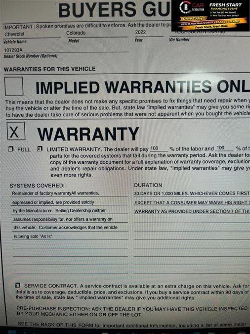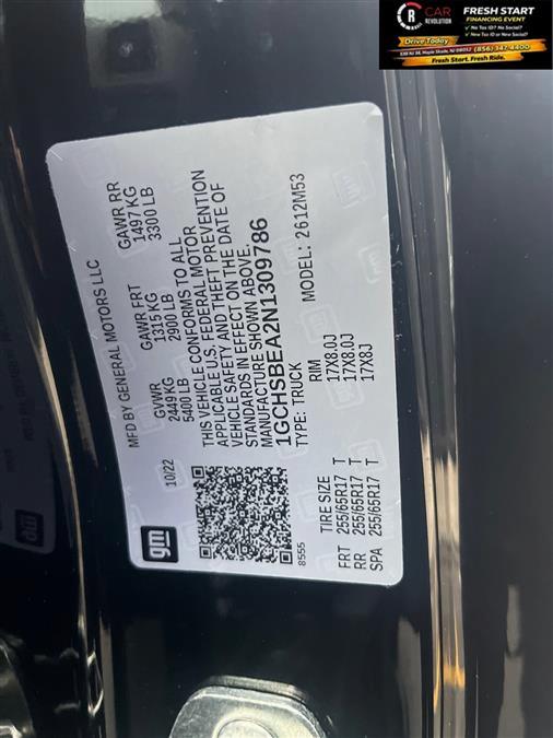 Check out this pre-owned 2022 Chevrolet Colorado we recently got in. This Chevrolet includes: Optional Equipment: Safety and Security Remote activated perimeter approach lighting Illuminated entry Security system Remote panic alarm Safety Unauthorized Entry Theft-Deterrent System Security system Convenience Cruise control with steering wheel mounted controls Power door locks with 2 stage unlocking Keyfob keyless entry Tailgate/power door lock EZ Lift EZ Lower Comfort Cloth front seat upholstery Cloth front seatback upholstery Cloth rear seat upholstery Exterior and Appearance Non-metallic paint Front license plate bracket Seating Cloth Seat Trim Cloth front seat upholstery Cloth front seatback upholstery Cloth rear seat upholstery Exterior Front License Plate Kit Front license plate bracket Black Bowtie Emblem Package EZ-Lift and Lower Tailgate EZ Lift EZ Lower Additional Options WT Convenience Package Remote activated perimeter approach lighting Illuminated entry Cruise control with steering wheel mounted controls Power door locks with 2 stage unlocking Keyfob keyless entry Auto-locking doors Tailgate/power door lock Security system EZ Lift EZ Lower Remote panic alarm Preferred Equipment Group 2WT Interior Remote Locking Tailgate Tailgate/power door lock Extended Range Remote Keyless Entry Remote activated perimeter approach lighting Illuminated entry Power door locks with 2 stage unlocking Keyfob keyless entry Auto-locking doors Remote panic alarm Electronic Automatic Cruise Control Cruise control with steering wheel mounted controls Jet Black/Dark Ash Fuel Economy and Emissions Mass emissions Paint Black Non-metallic paint Emissions CT/DE/ME/MD/MA/NJ/NY/OR/PA/RI/VT/WA Emissions Requirements Mass emissions *Note - For third party subscriptions or services, please contact the dealer for more information.* This low mileage Chevrolet Colorado has barely been touched. It's the next best thing to buying new. You've found the one you've been looking for. Your dream car. The quintessential Chevrolet -- This Chevrolet Colorado 2WD Work Truck speaks volumes about its owner, about uncompromising individuality, a passion for driving and standards far above the ordinary. Car Revolution has been in business since 1998 with 2 locations and over 300 cars. A family owned business, focused and determined to extend hospitality to all our clients. We make every effort to present information that is accurate. However, it is based on data provided by the vehicle manufacturer and other sources. Therefore exact Configuration, Color, Certification and Accessories should be used as a guide only and are not guaranteed under any circumstances, for any inaccuracies, claims of losses of any nature. All advertised prices includes all cost to be paid by the consumer, except: Title, Taxes, Registration, License Fees, Insurance, Dealer Prep, Additional Options and include all applicable rebates. Subject to Credit Approval. Every effort is made in order to display accurate and current vehicle information, including Pricing. All vehicles are subjected to prior sale, removal and transport elsewhere, awaiting Title and Ownership Confirmation. Inventory is updated daily and subject to change. Not responsible for typographical errors or omissions. To better insure the specific vehicle's availability, call us right away at 856-316-3444 and feel free to ask any questions. EMG-WB Looking for a clean, well-cared for 2022 Chevrolet Colorado? This is it. With less than 43,345mi on this Chevrolet Colorado, you'll appreciate the practically showroom newness of this vehicle. Driven by many, but adored by more, the Chevrolet Colorado 2WD Work Truck is a perfect addition to any home. This vehicle won't last long, take it home today. The Chevrolet Colorado 2WD Work Truck will provide you with everything you have always wanted in a car -- Quality, Reliability, and Character. Car Revolution has been in business since 1998 with 2 locations and over 300 cars. A family owned business, focused and determined to extend hospitality to all our clients. We make every effort to present information that is accurate. However, it is based on data provided by the vehicle manufacturer and other sources. Therefore exact Configuration, Color, Certification and Accessories should be used as a guide only and are not guaranteed under any circumstances, for any inaccuracies, claims of losses of any nature. All advertised prices includes all cost to be paid by the consumer, except: Title, Taxes, Registration, License Fees, Insurance, Dealer Prep, Additional Options and include all applicable rebates. Subject to Credit Approval. Every effort is made in order to display accurate and current vehicle information, including Pricing. All vehicles are subjected to prior sale, removal and transport elsewhere, awaiting Title and Ownership Confirmation. Inventory is updated daily and subject to change. Not responsible for typographical errors or omissions. To better insure the specific vehicle's availability, call us right away at 856-316-3444 and feel free to ask any questions. EMG-WB